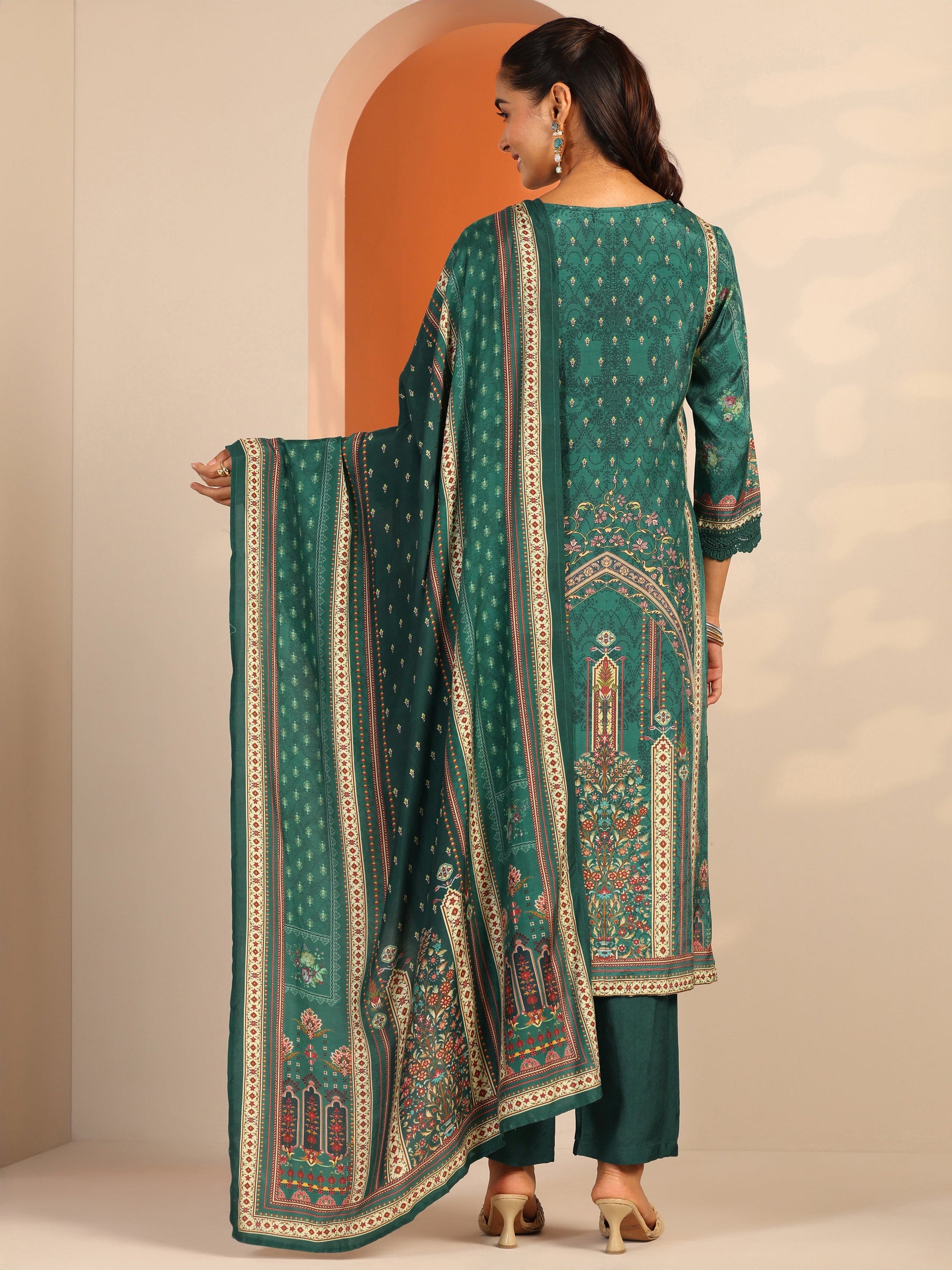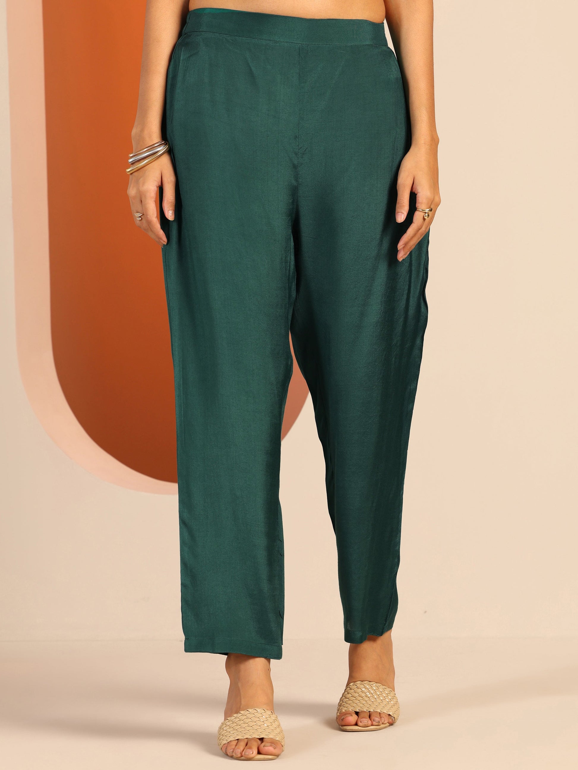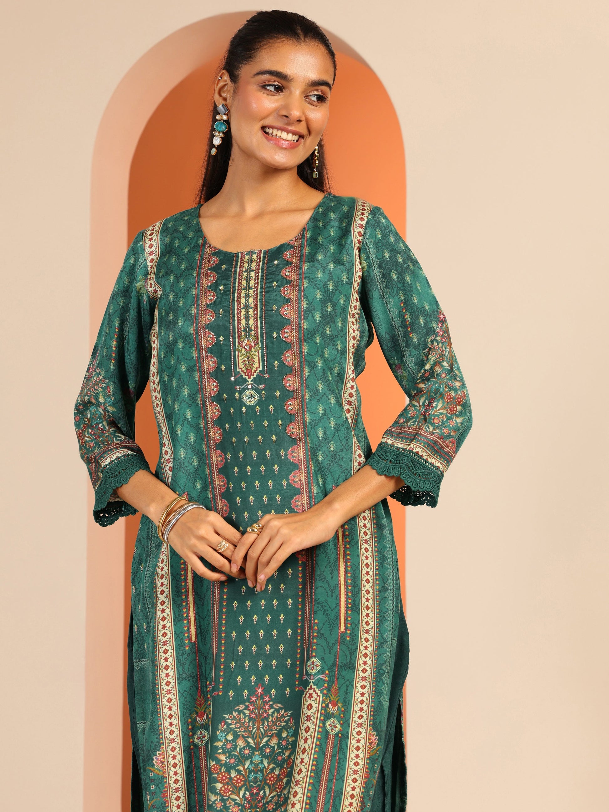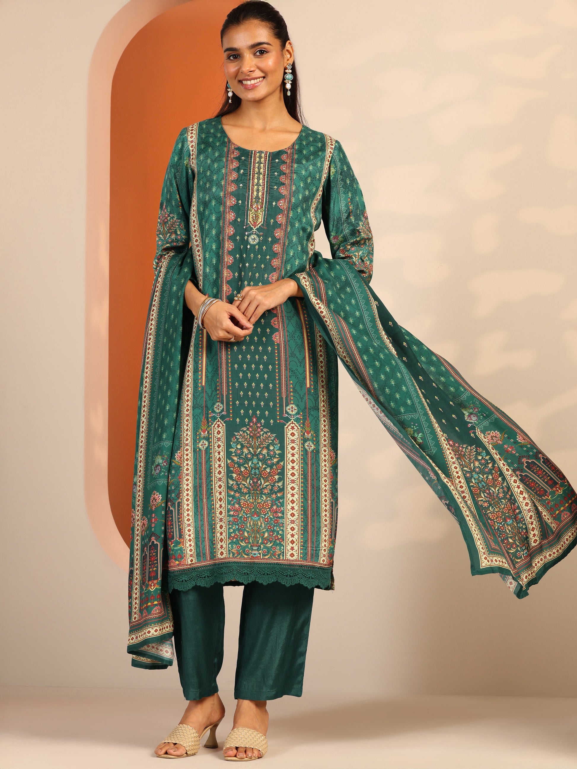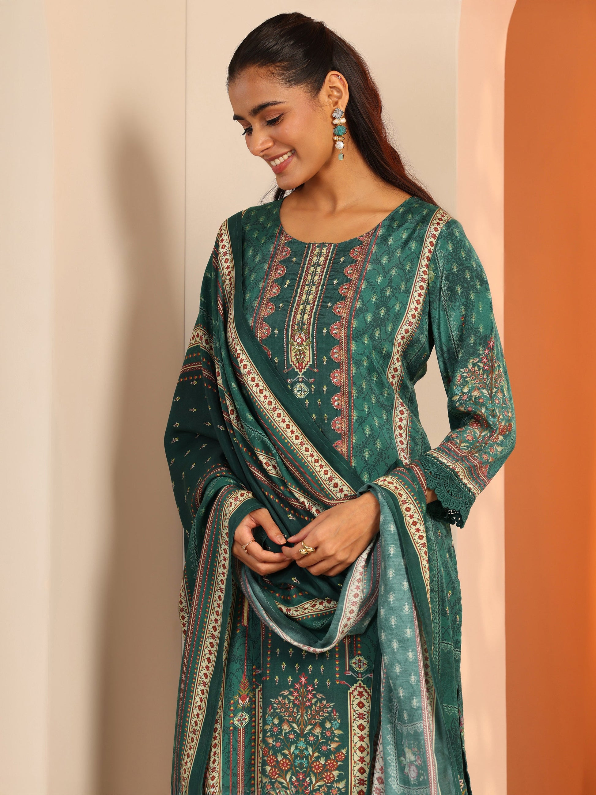 Our 3-piece green muslin kurta set features a straight-fit design with a round neckline, regular sleeves, and a statement yoke. Complemented with lining and straight pants with a partially elasticated waistband and 2 pockets, and a printed dupatta. Adorned with ethnic motif printed accents, this style is perfect for festive wear.