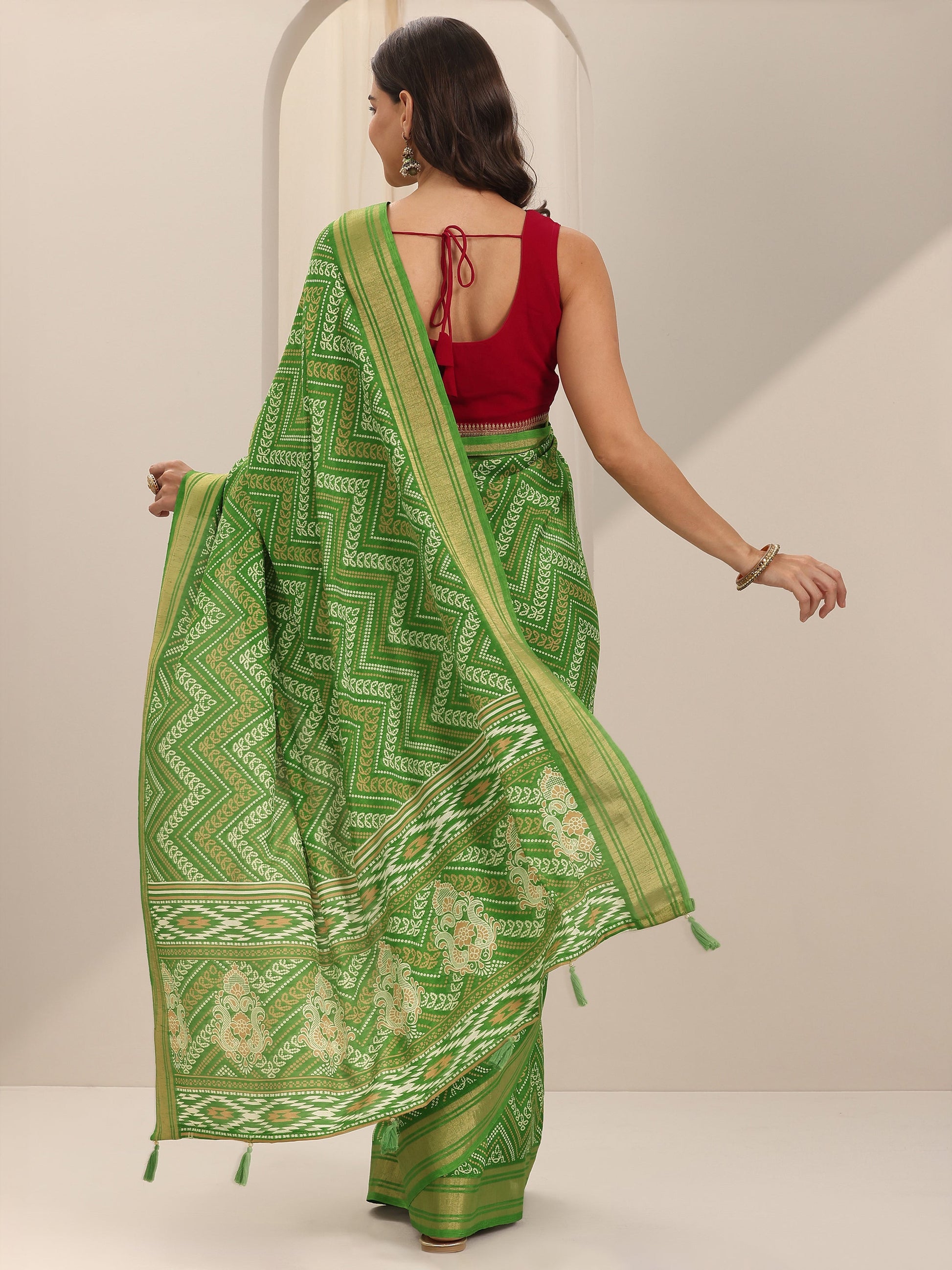 Green Printed Silk Blend Saree With Unstitched Blouse Piece