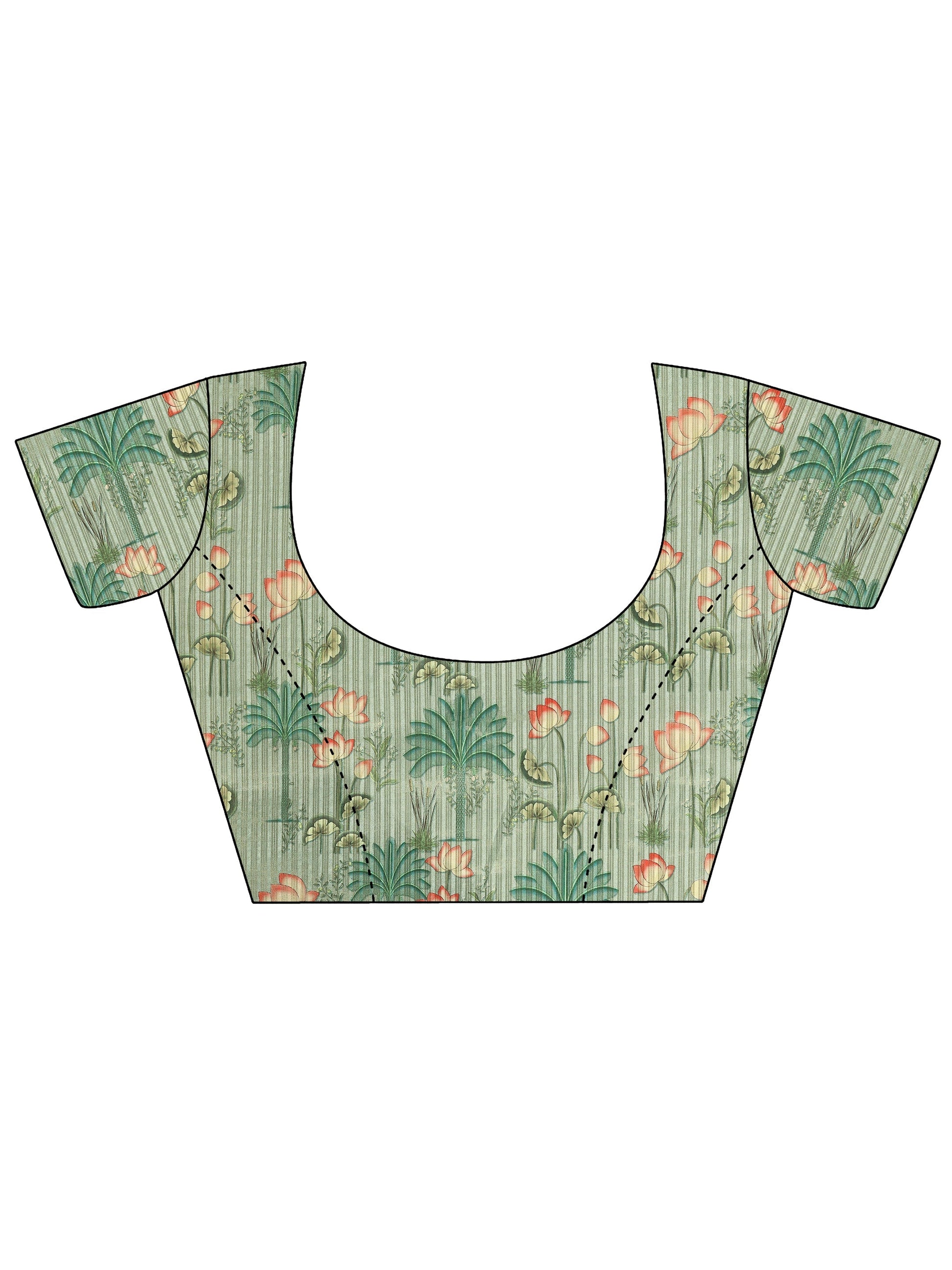 Green Printed Silk Blend Saree With Unstitched Blouse Piece