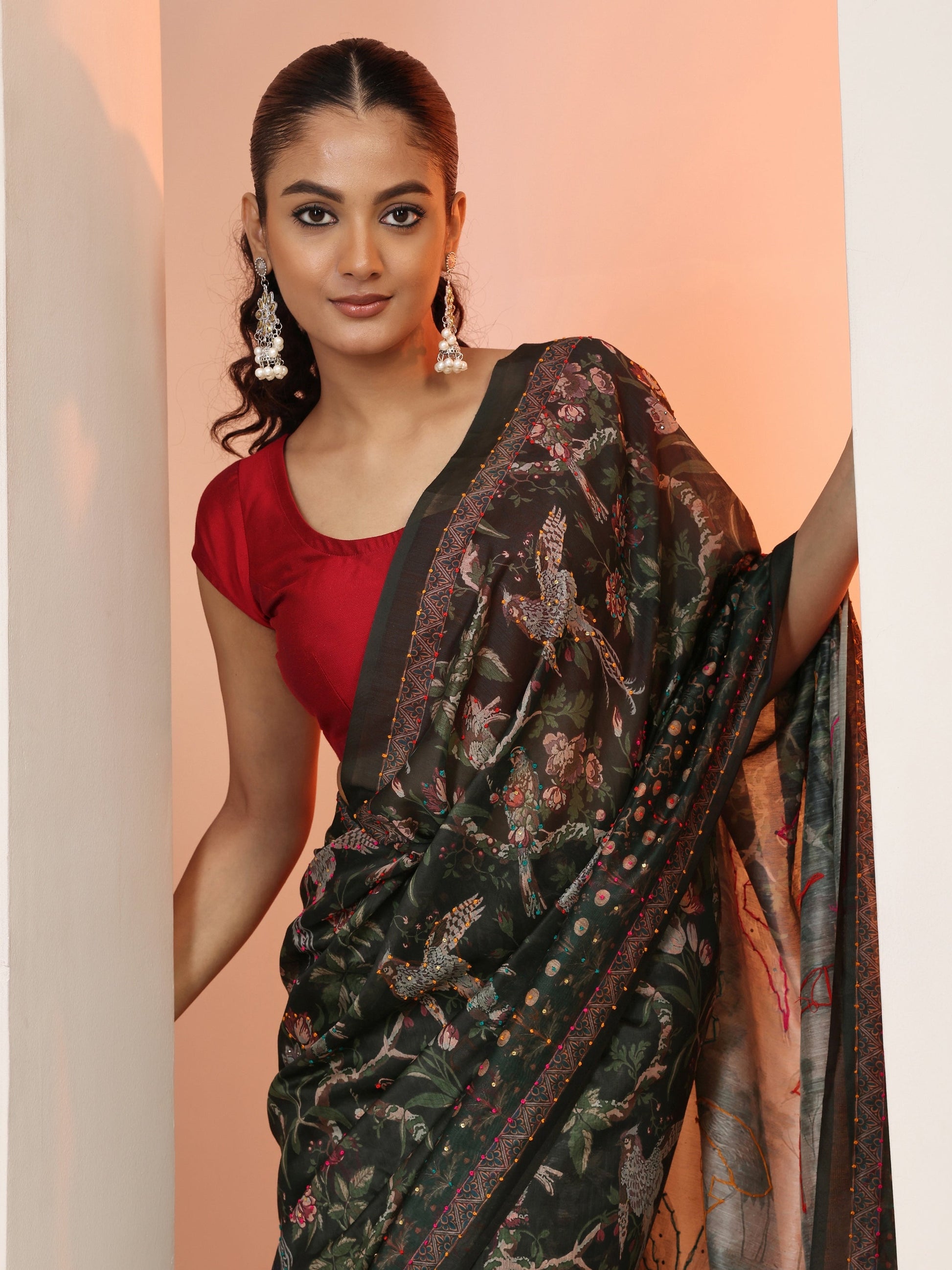 Green Printed Silk Blend Saree With Unstitched Blouse Piece