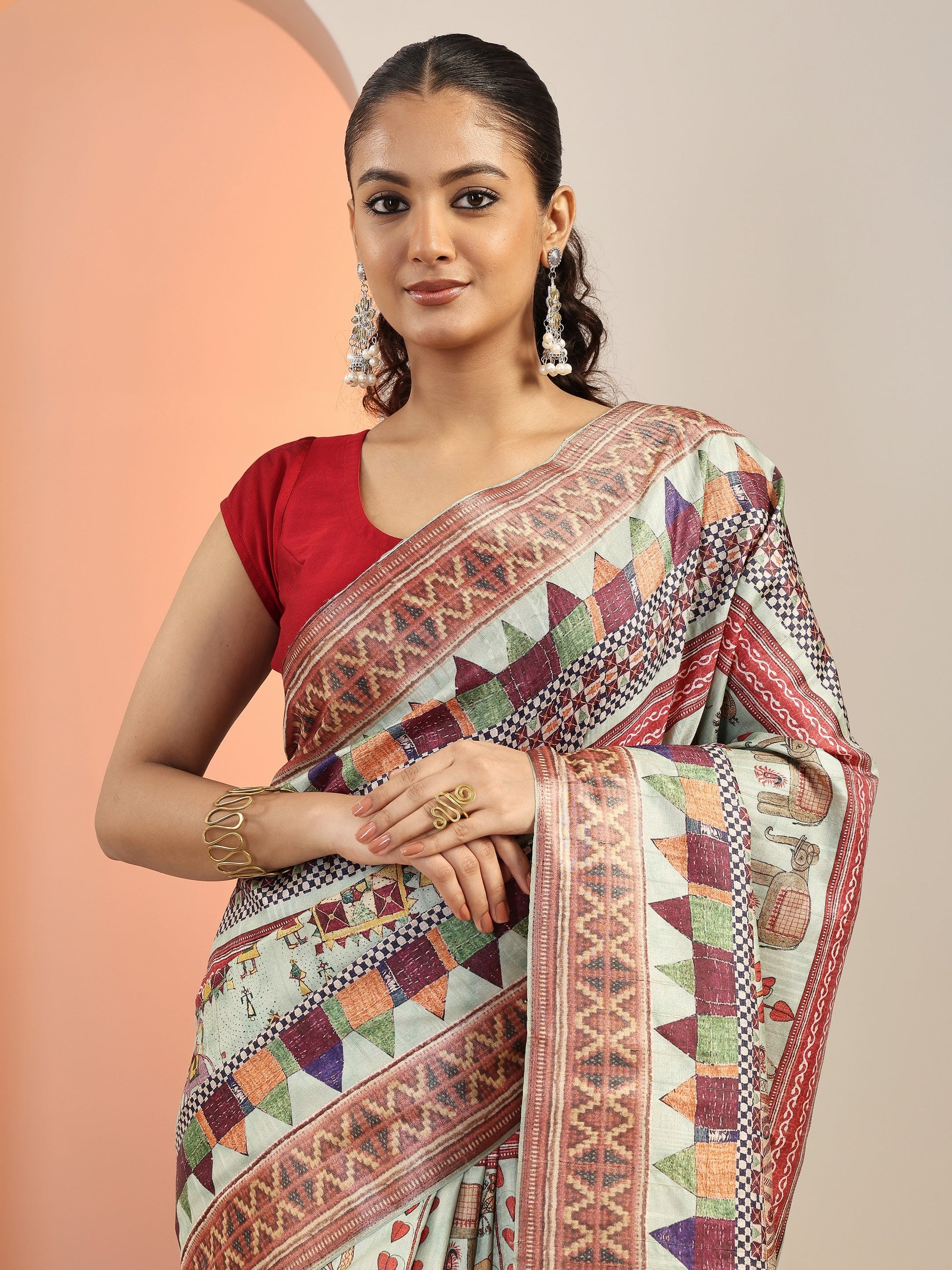 Our Multi Printed Silk Blend Saree Features Captivating Ethnic Motif Printed Design. Complemented With An Unstitched Blouse Piece. This Charming Saree Is Perfect For Festive Wear
