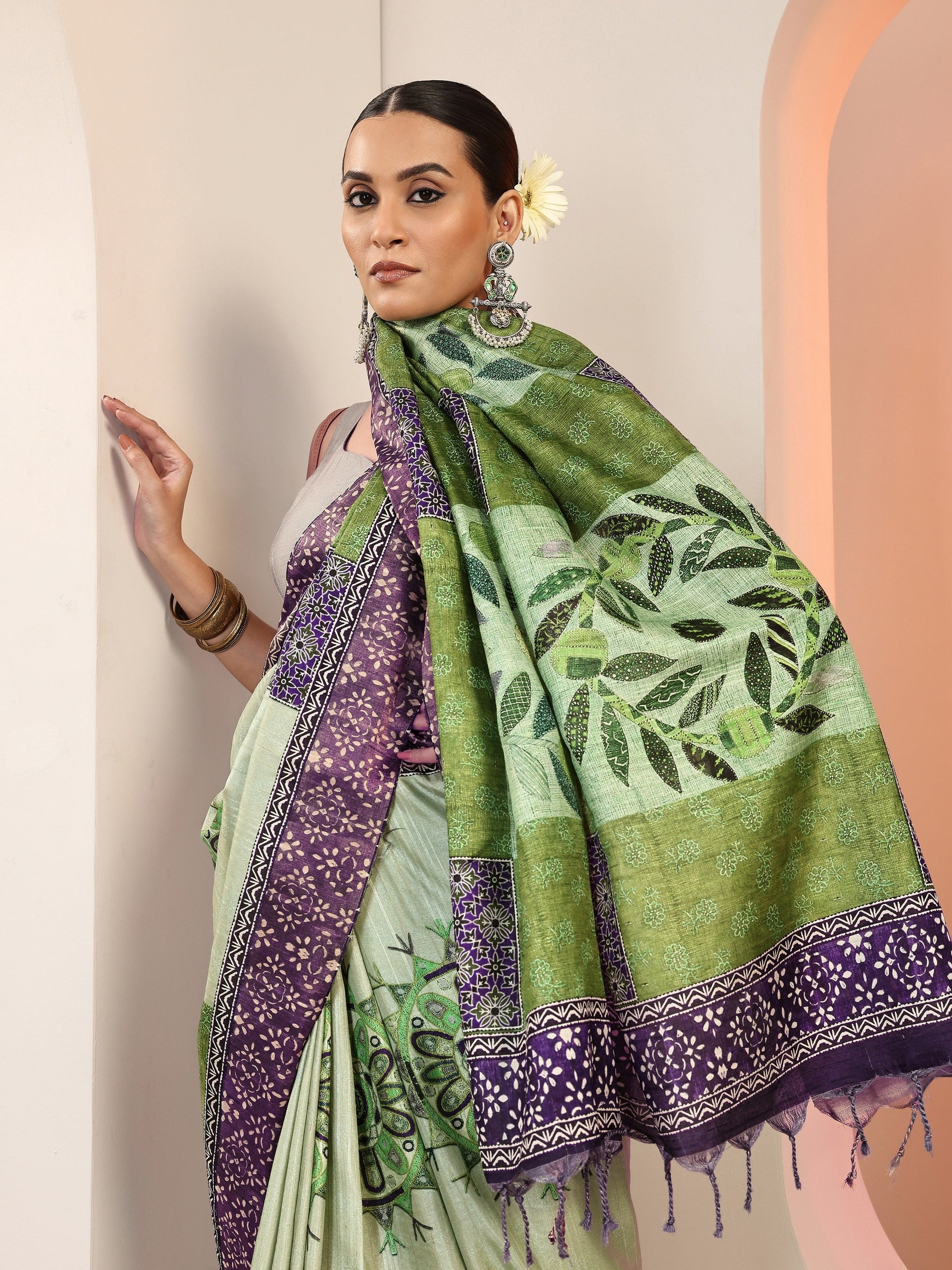 Green Printed Silk Blend Saree With Unstitched Blouse Piece