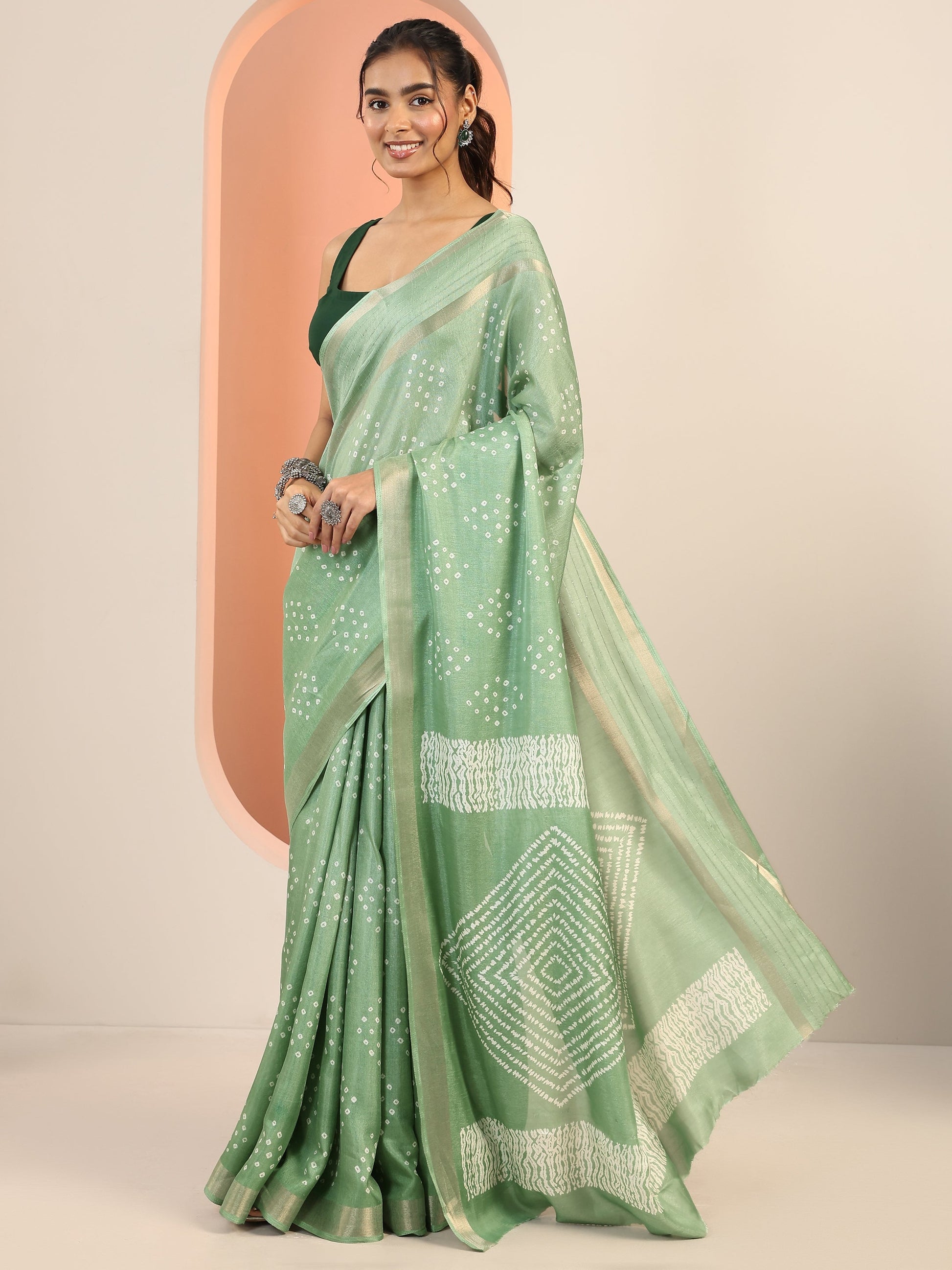 Our Sea Green Printed Silk Blend Saree Features Captivating Bandhani Printed Design. Complemented With An Unstitched Blouse Piece. This Charming Saree Is Perfect For Festive Wear