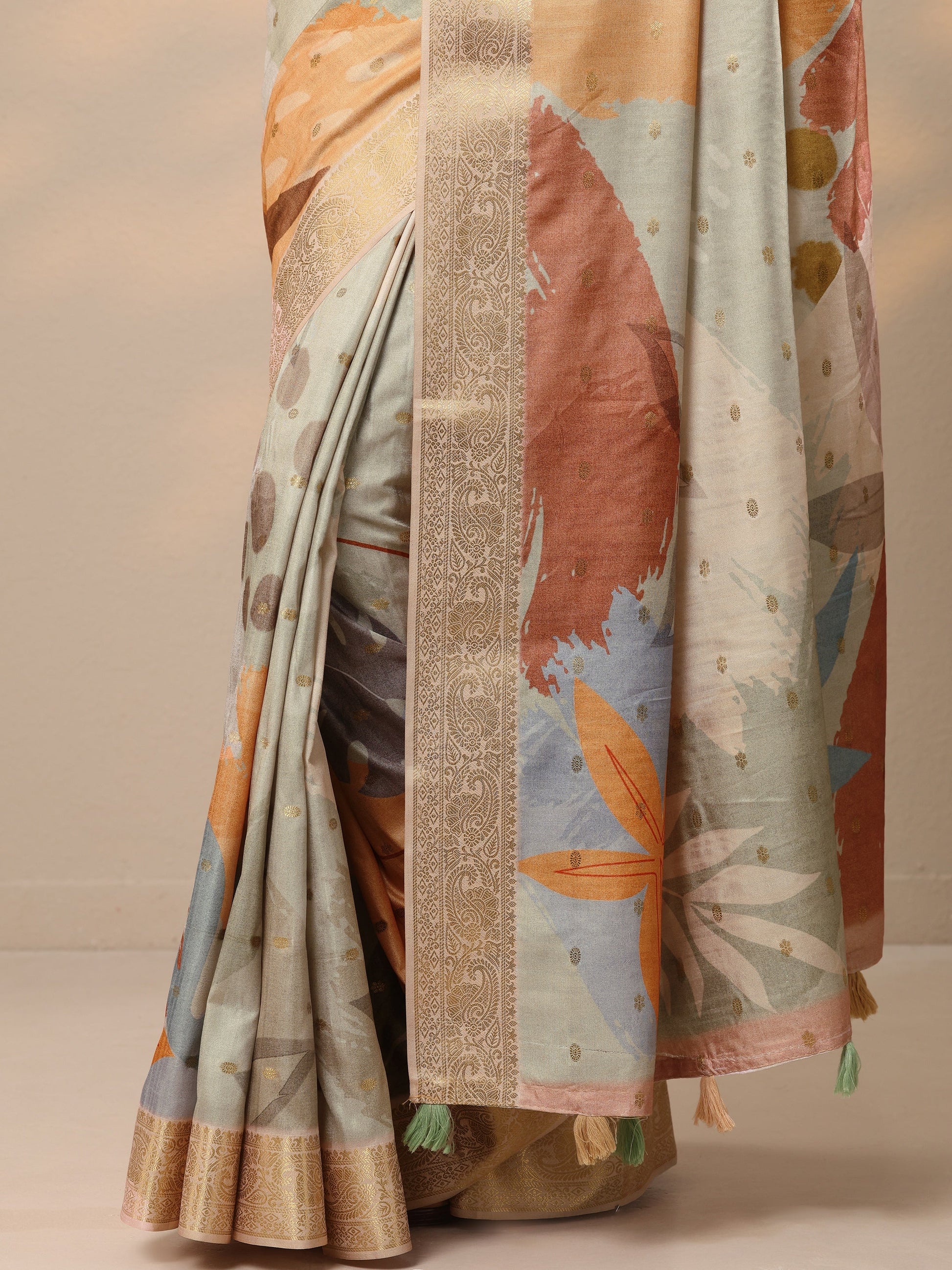 Green Printed Silk blend Saree With Unstitched Blouse Piece