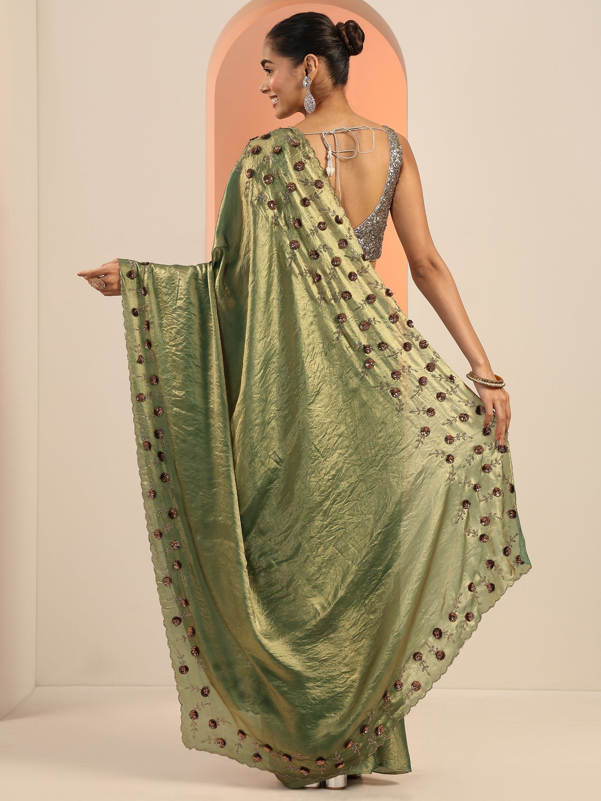 Our Olive Satin Saree Features Captivating Solid Embellishments. Complemented With An Unstitched Blouse Piece. This Charming Saree Is Perfect For Festive Wear