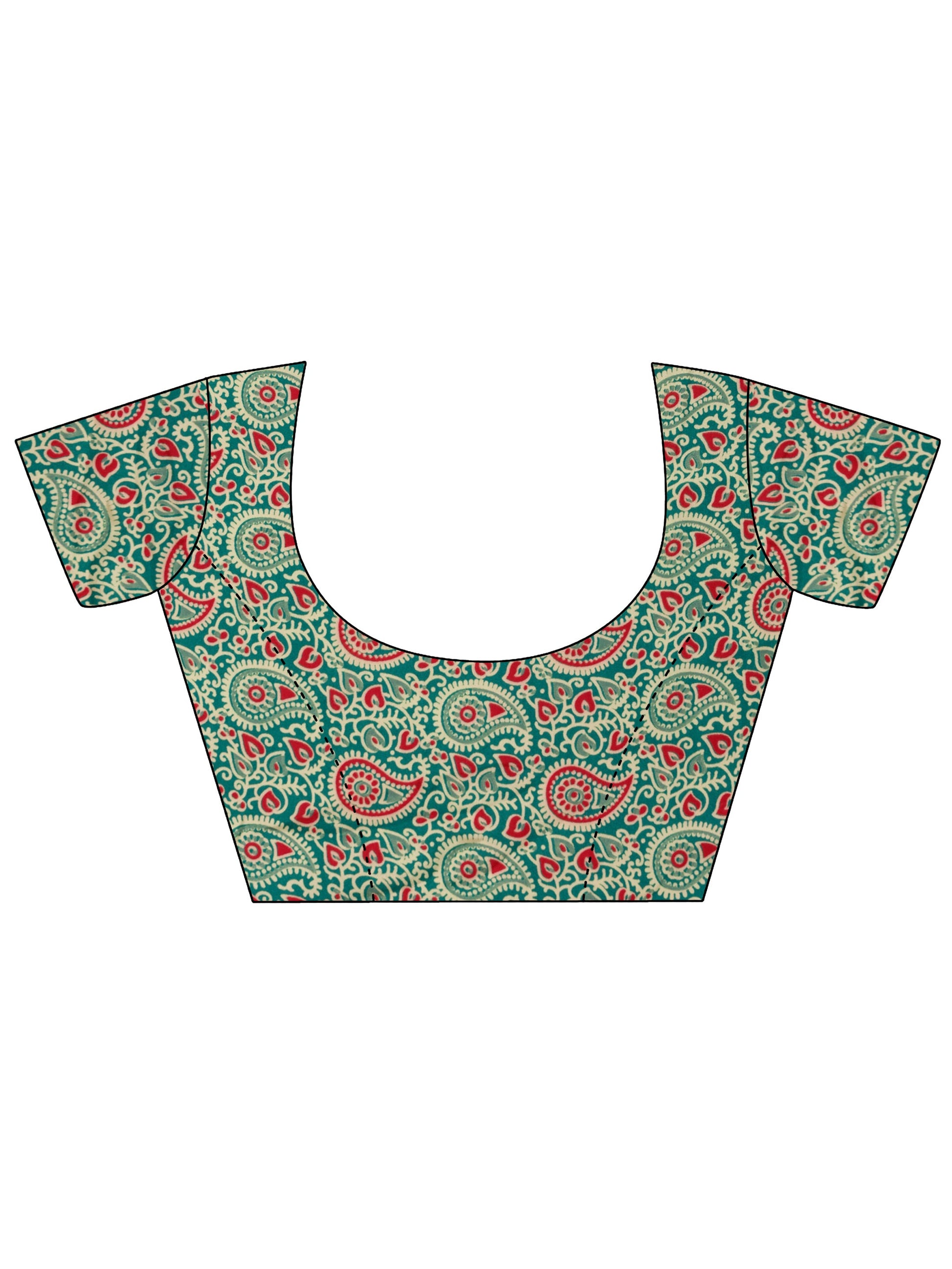 Our Teal Printed Satin Saree Features Captivating Paisley Print. Complemented With An Unstitched Blouse Piece. This Charming Saree Is Perfect For Festive Wear
