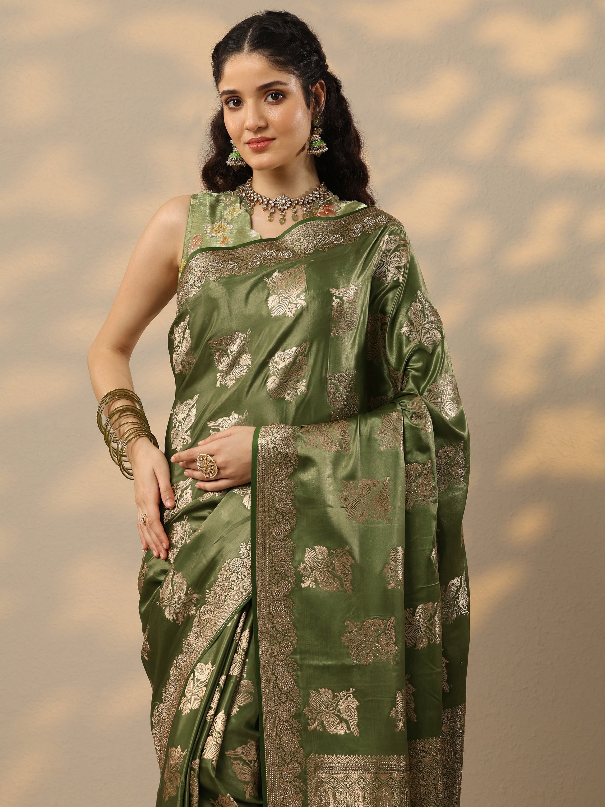 Green Woven Design Banarasi Silk Blend Saree With Unstitched Blouse Piece