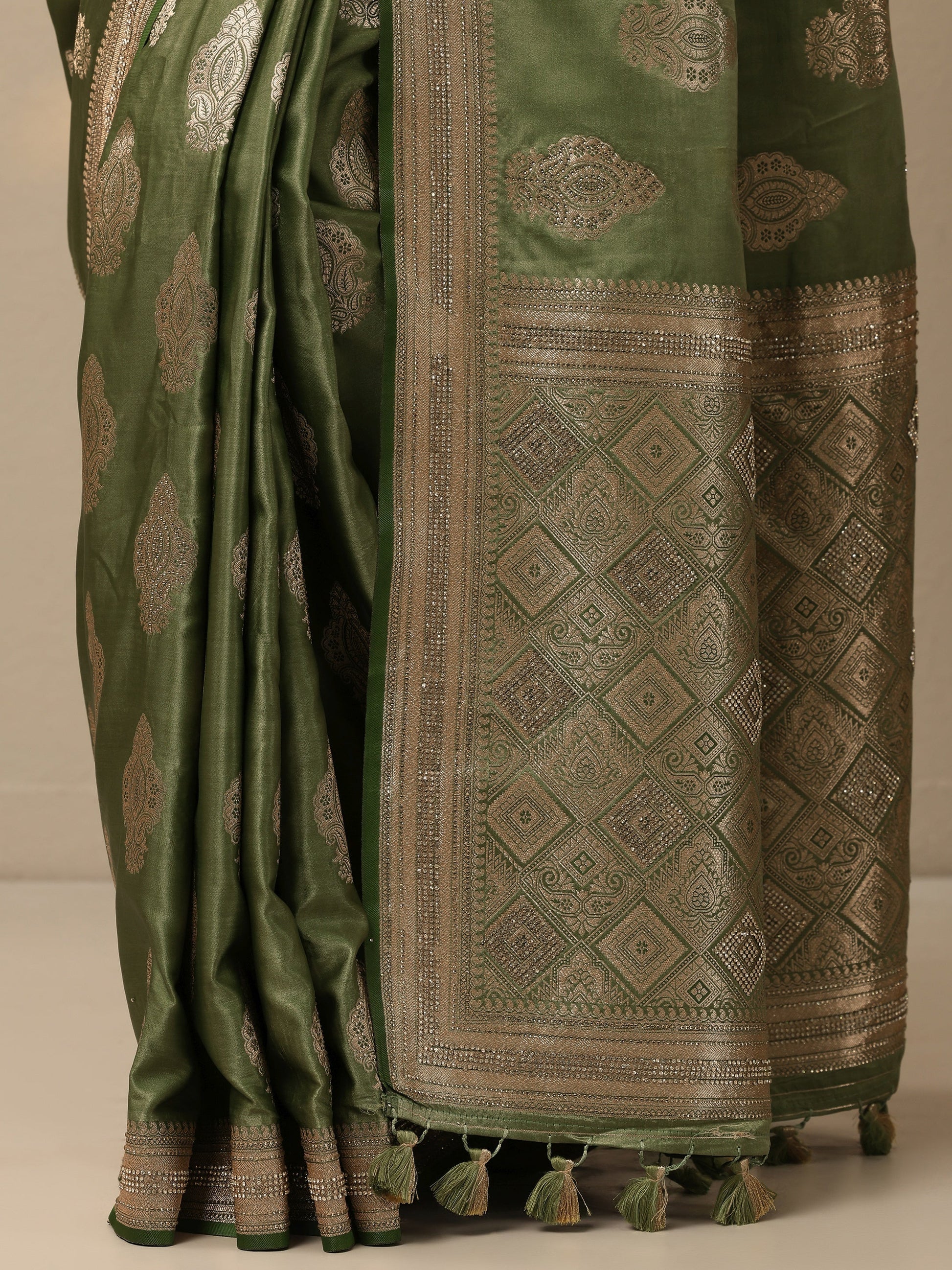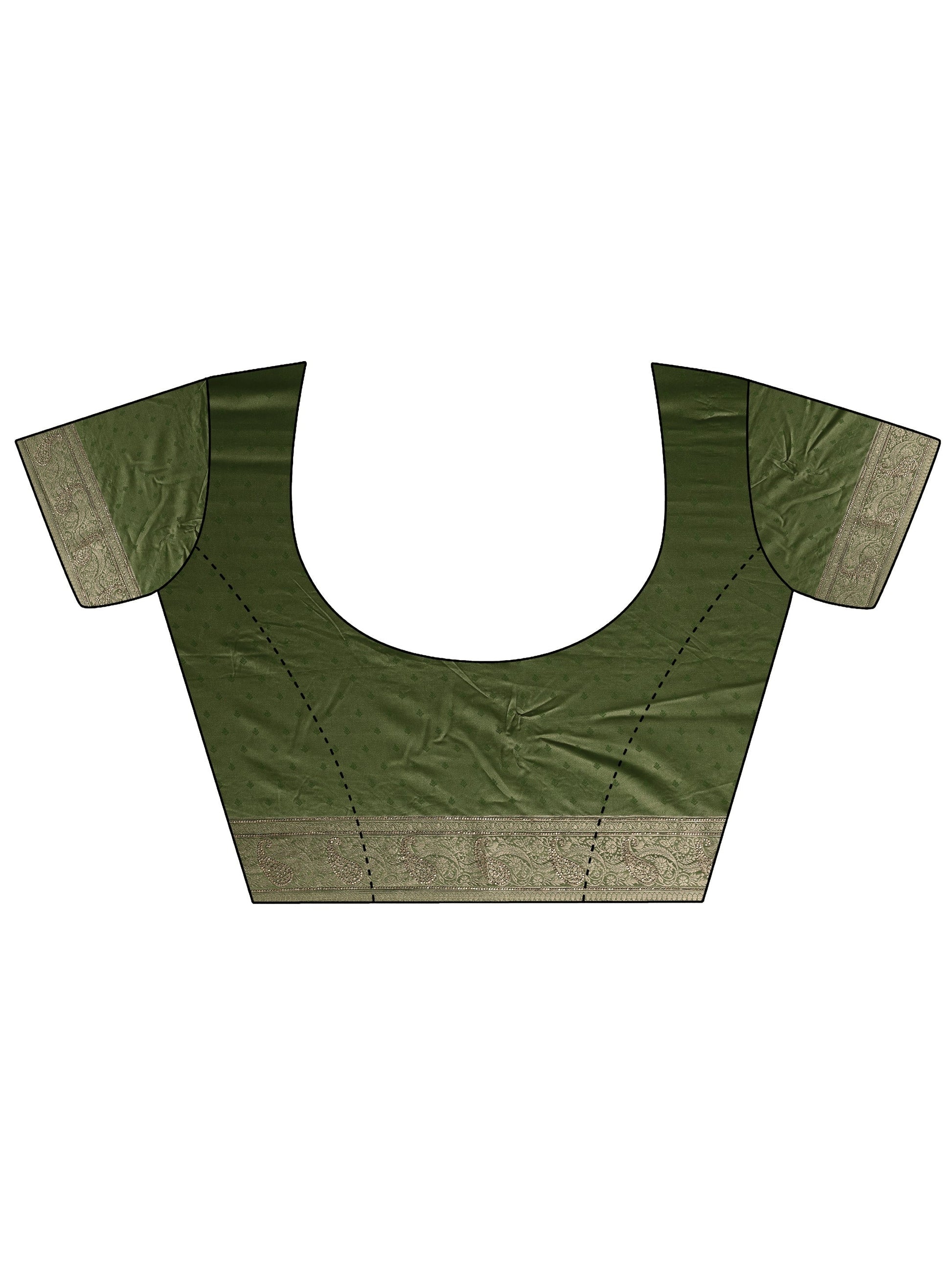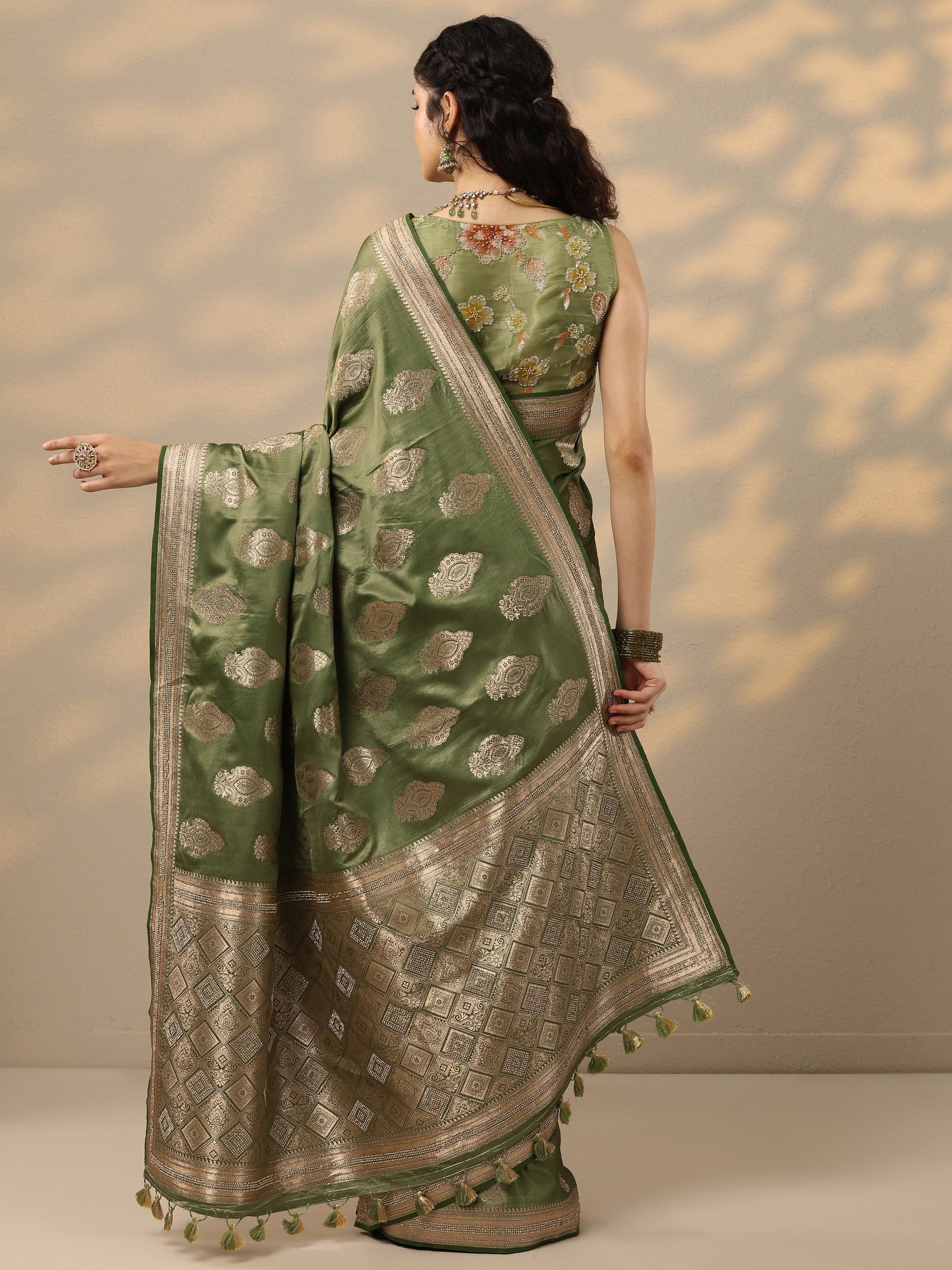 Our olive printed silk blend saree features captivating embellishments. Complemented with a stitched blouse. This charming saree is perfect for festive occasions.