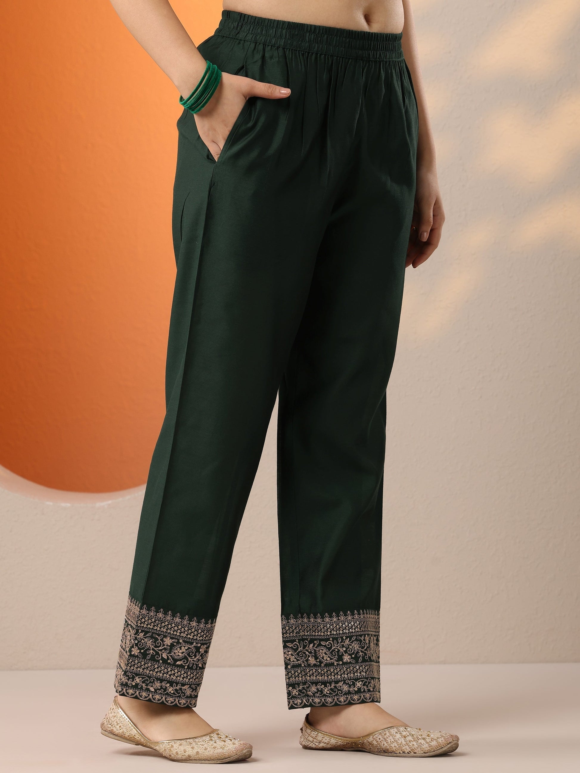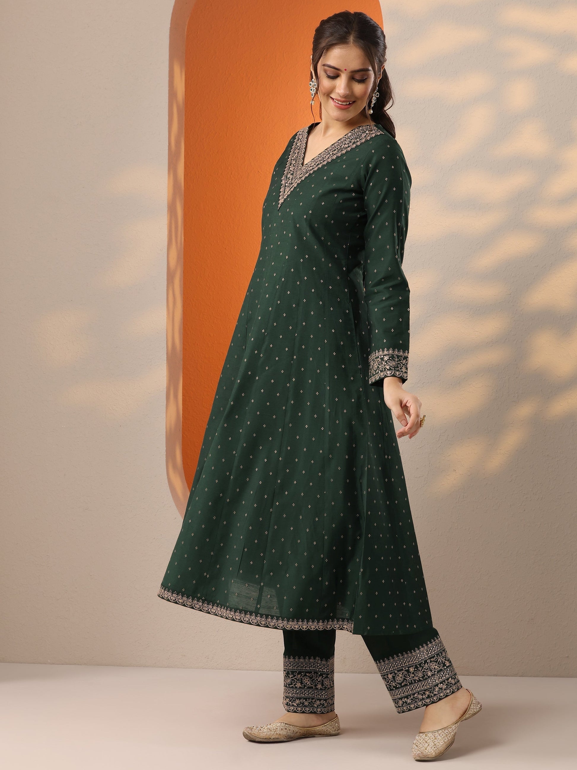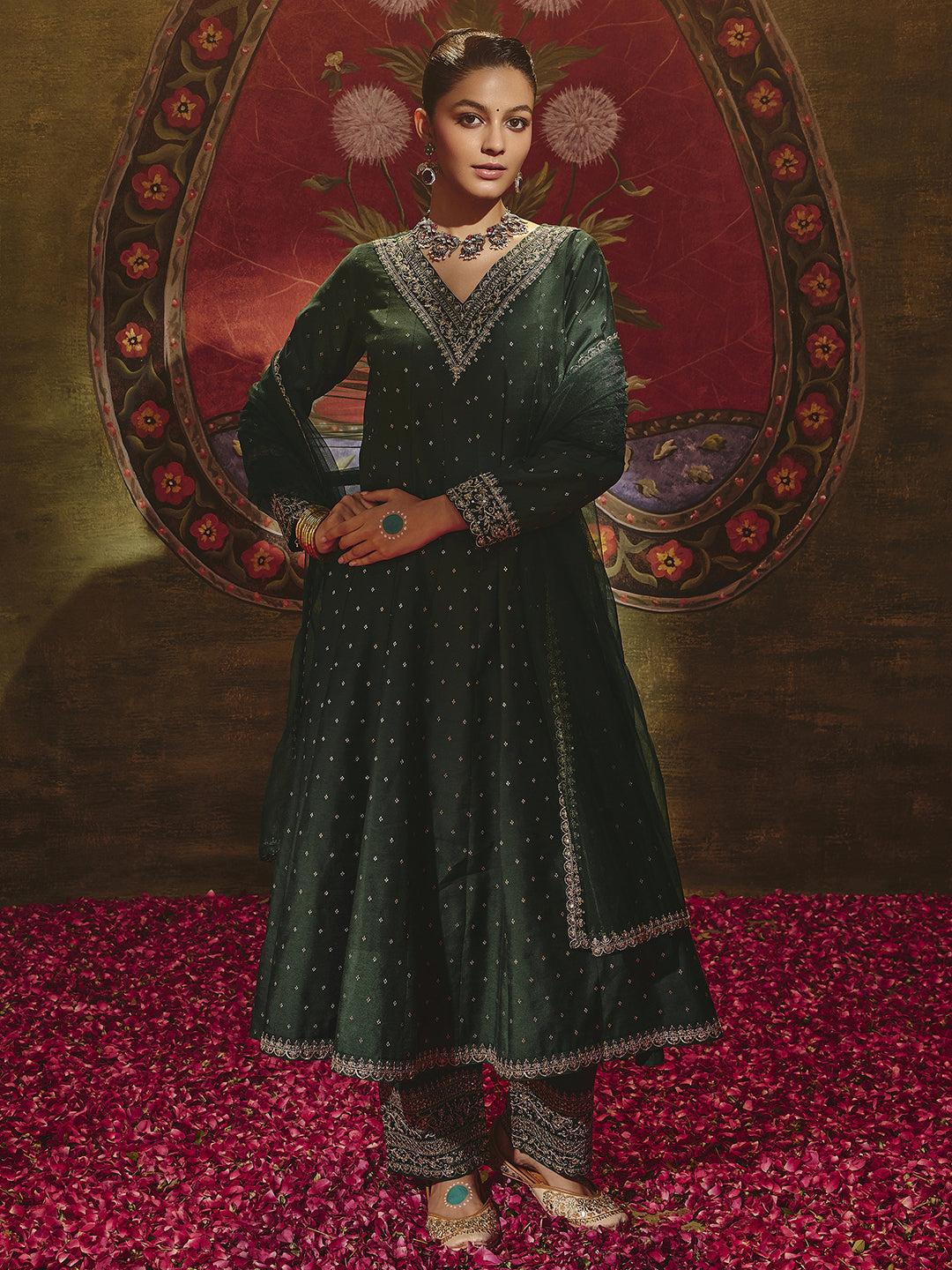 Our 3-piece Green Silk blend Anarkali Kurta Set features a V-Neckline, Regular Sleeves, and statement Yoke. Complemented with Straight Pants with a Partially Elasticated waistband and 2 pockets, and an Embroidered dupatta. Adorned with Embroidered accents, this style is perfect for Dark Festive occasions.