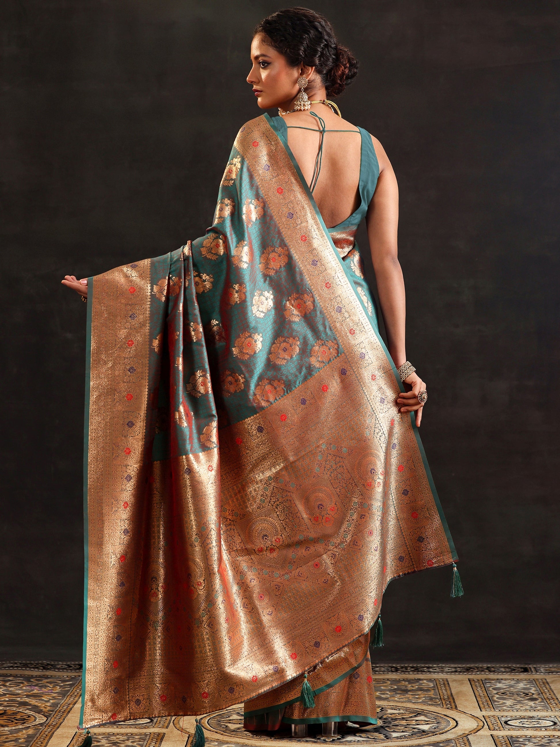 Green Woven Design Banarasi Silk Blend Saree With Unstitched Blouse Piece