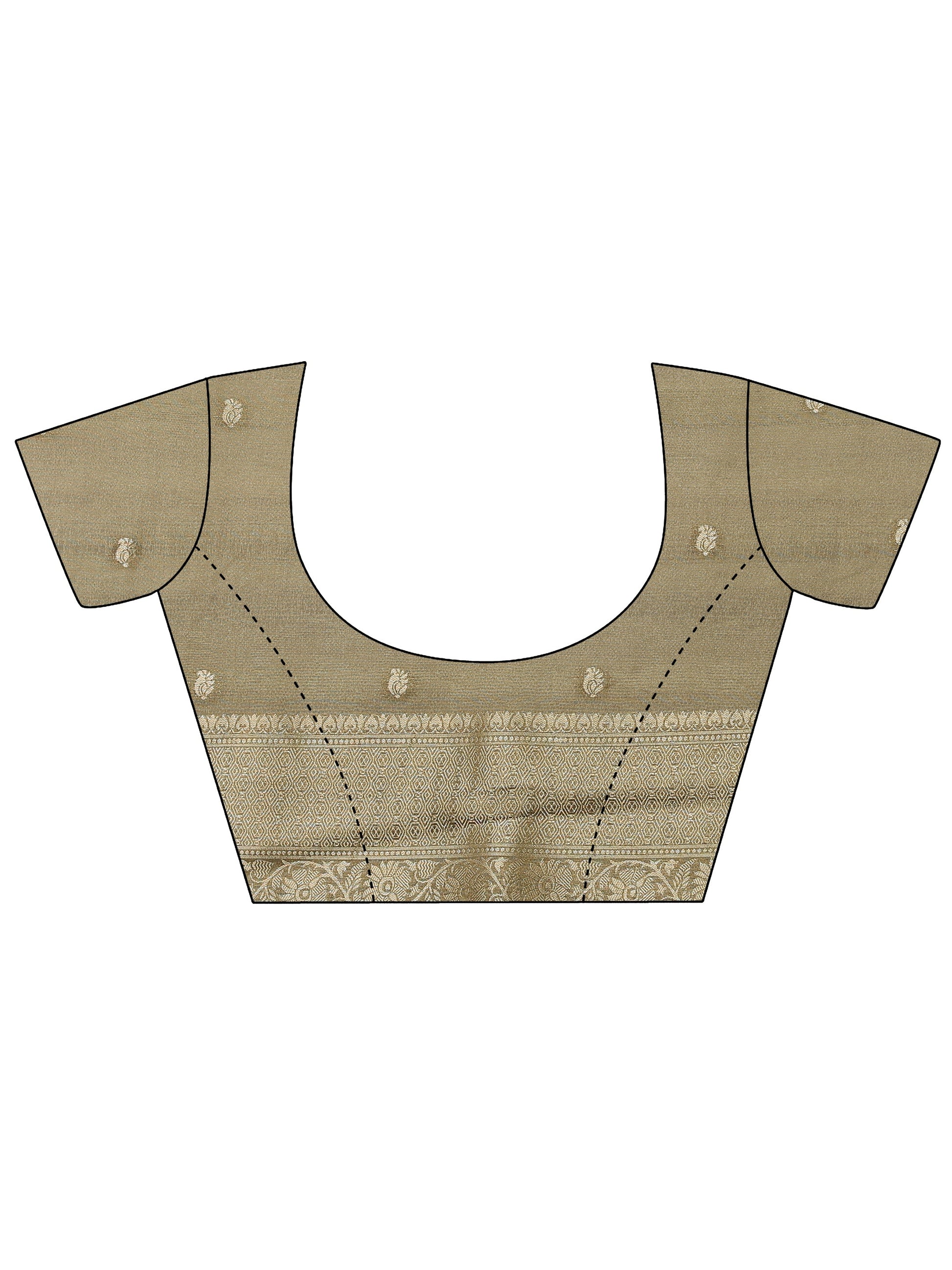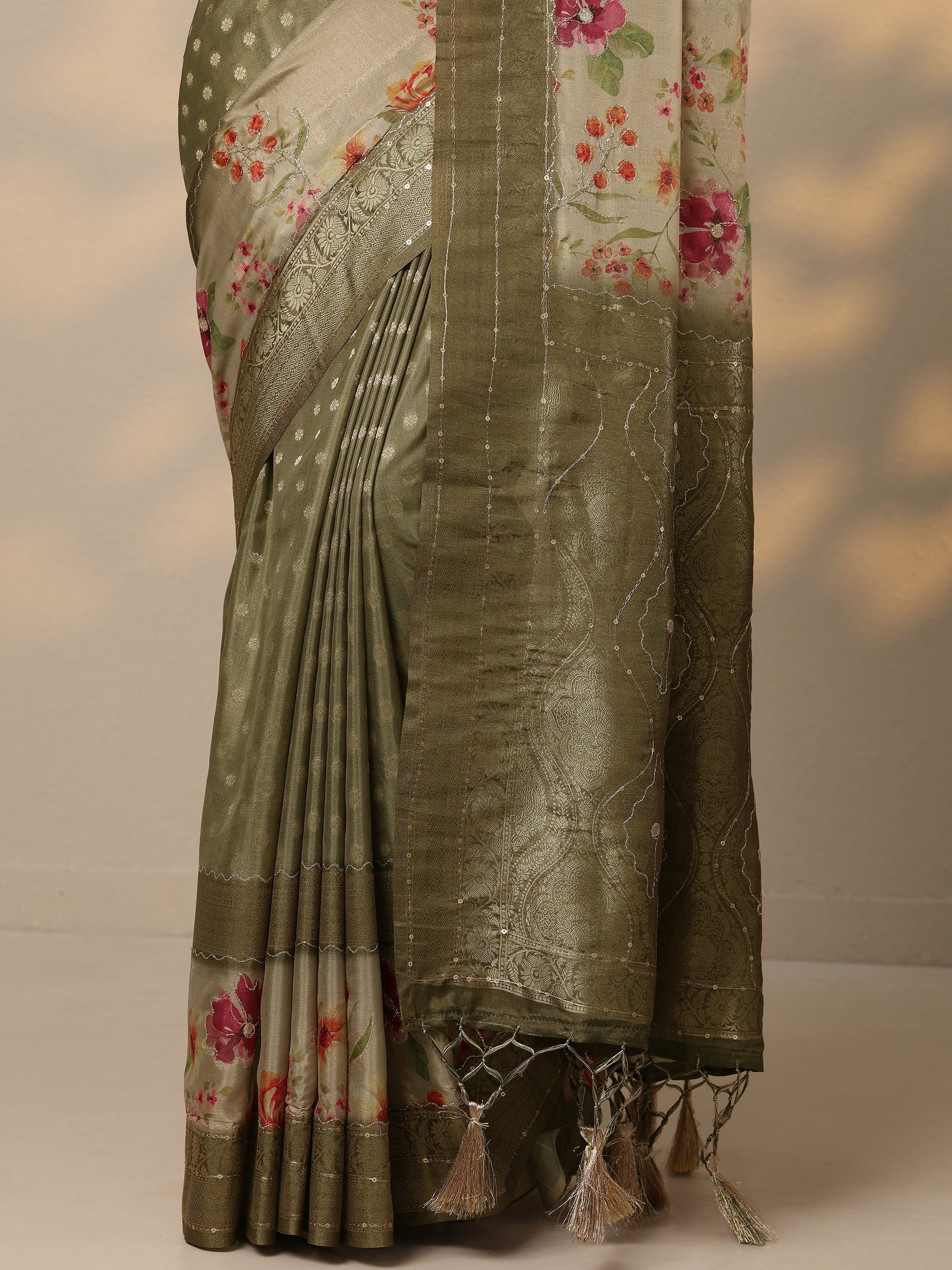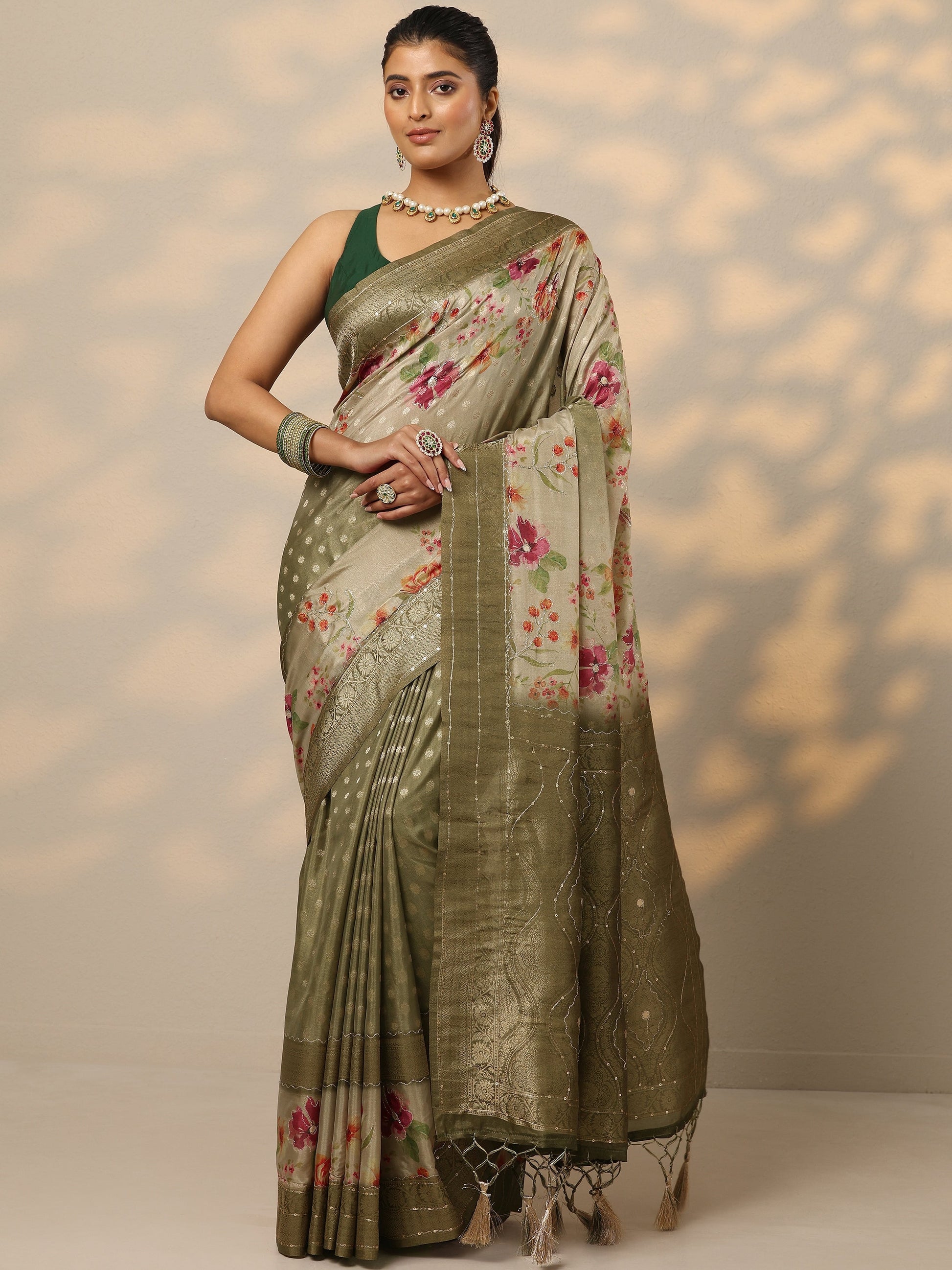 Our olive printed silk blend saree features captivating floral print. Complemented with a blouse piece. This charming saree is perfect for festive occasions.