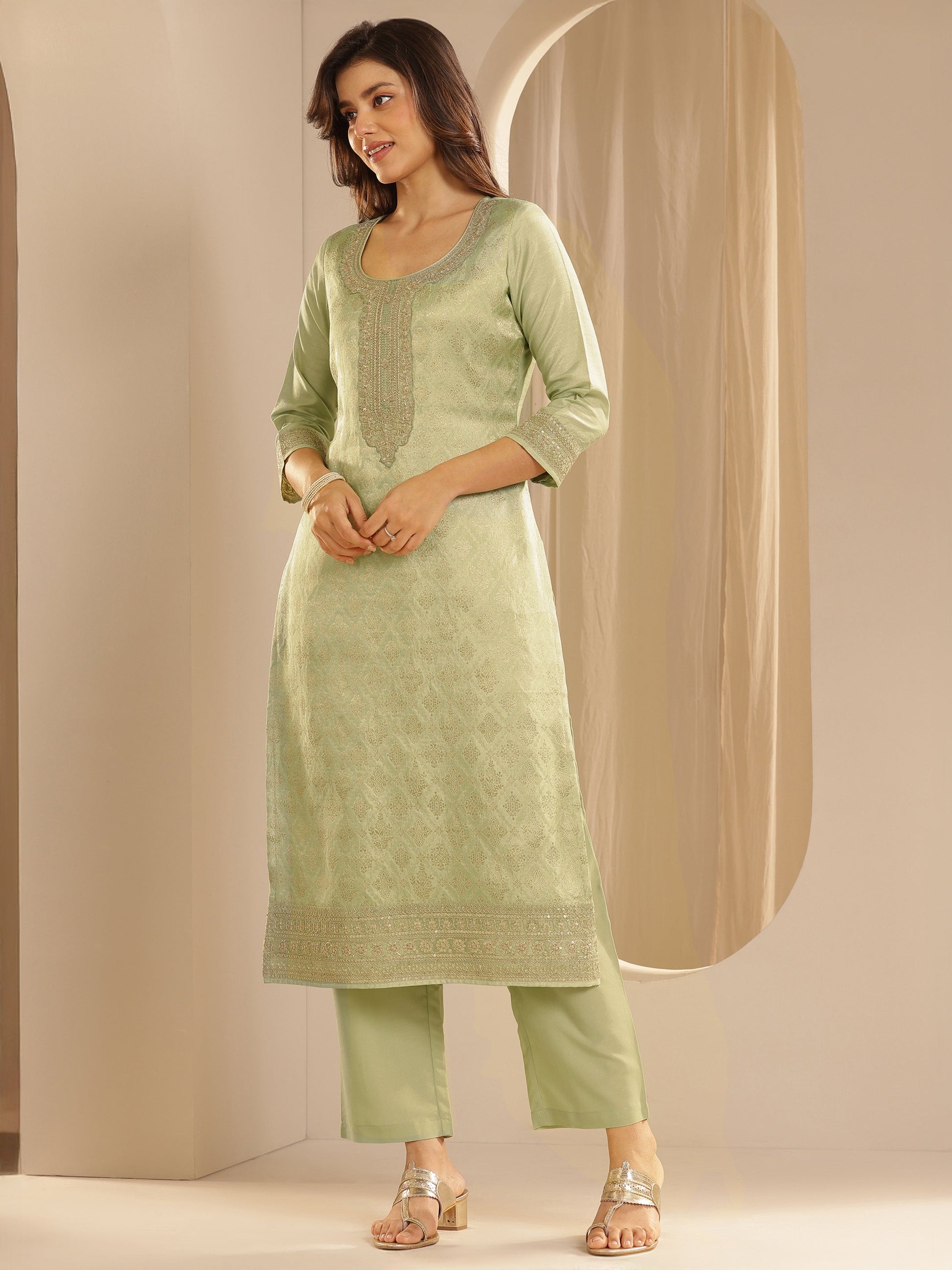 Green Woven Design Silk Blend Straight Suit Set With Dupatta