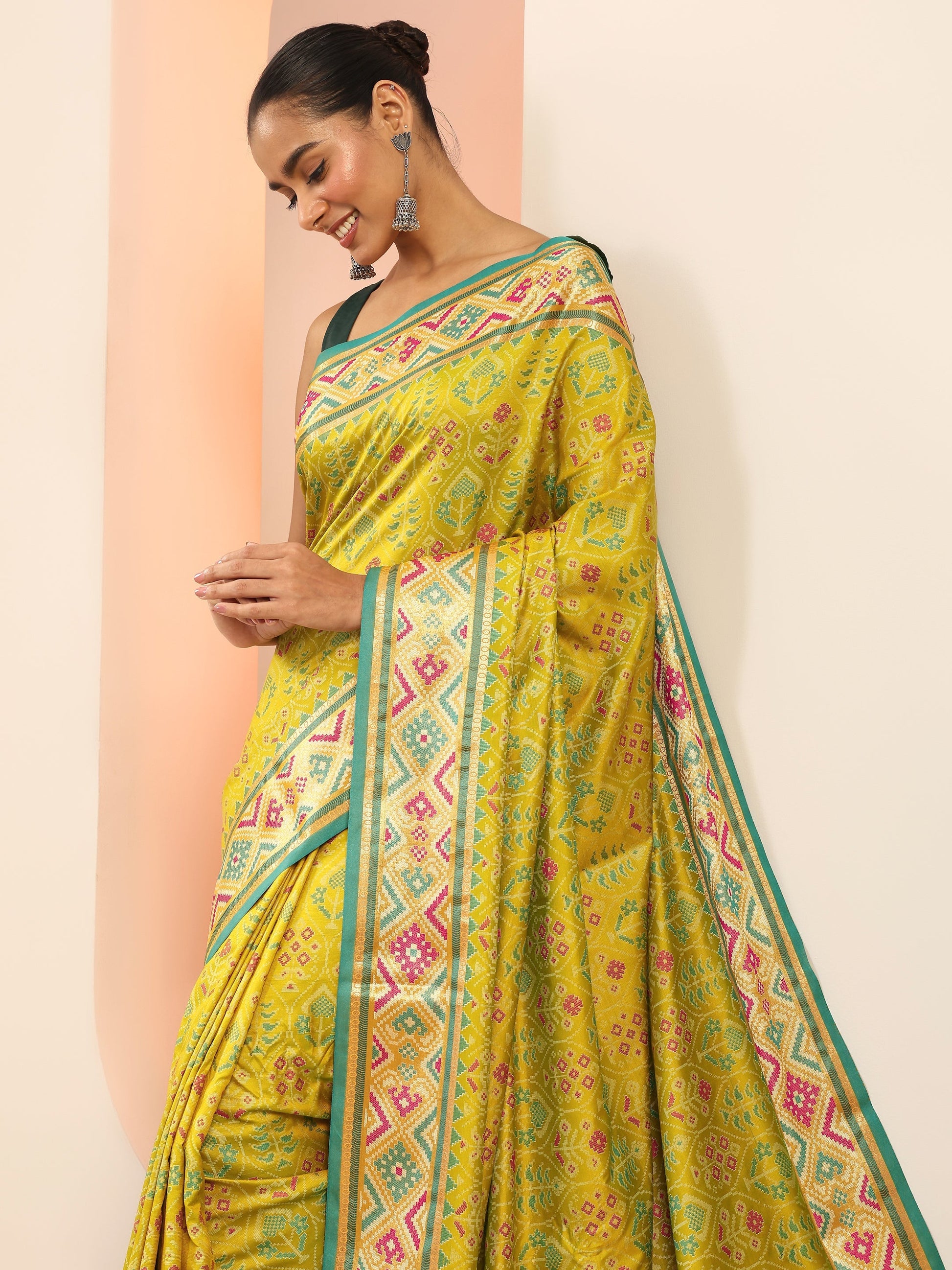 Our Yellow Printed Silk Blend Saree Features Captivating Woven Print. Complemented With An Unstitched Blouse Piece. This Charming Saree Is Perfect For Festive Wear