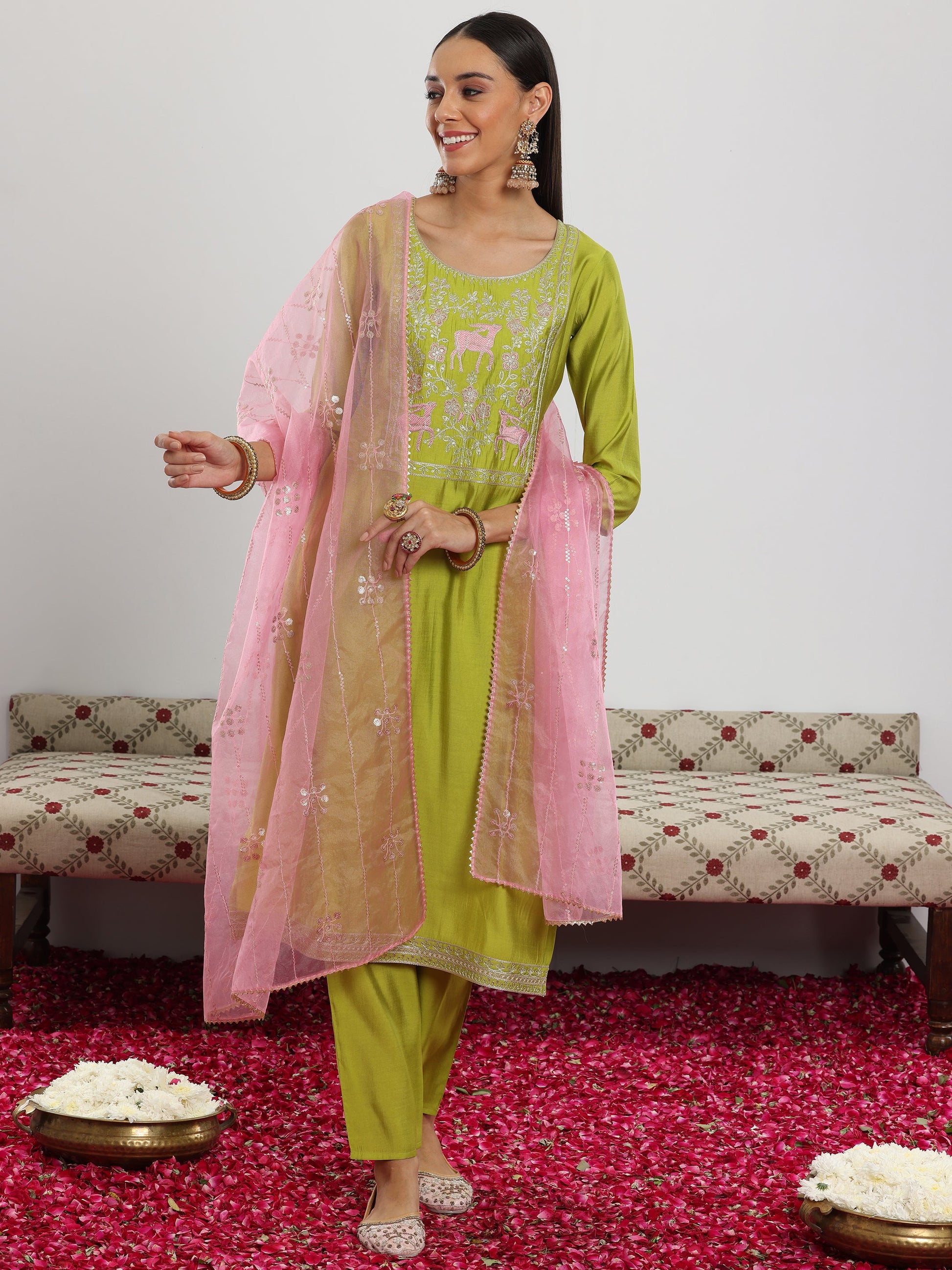 Green Yoke Design Silk Blend Straight Suit Set With Dupatta