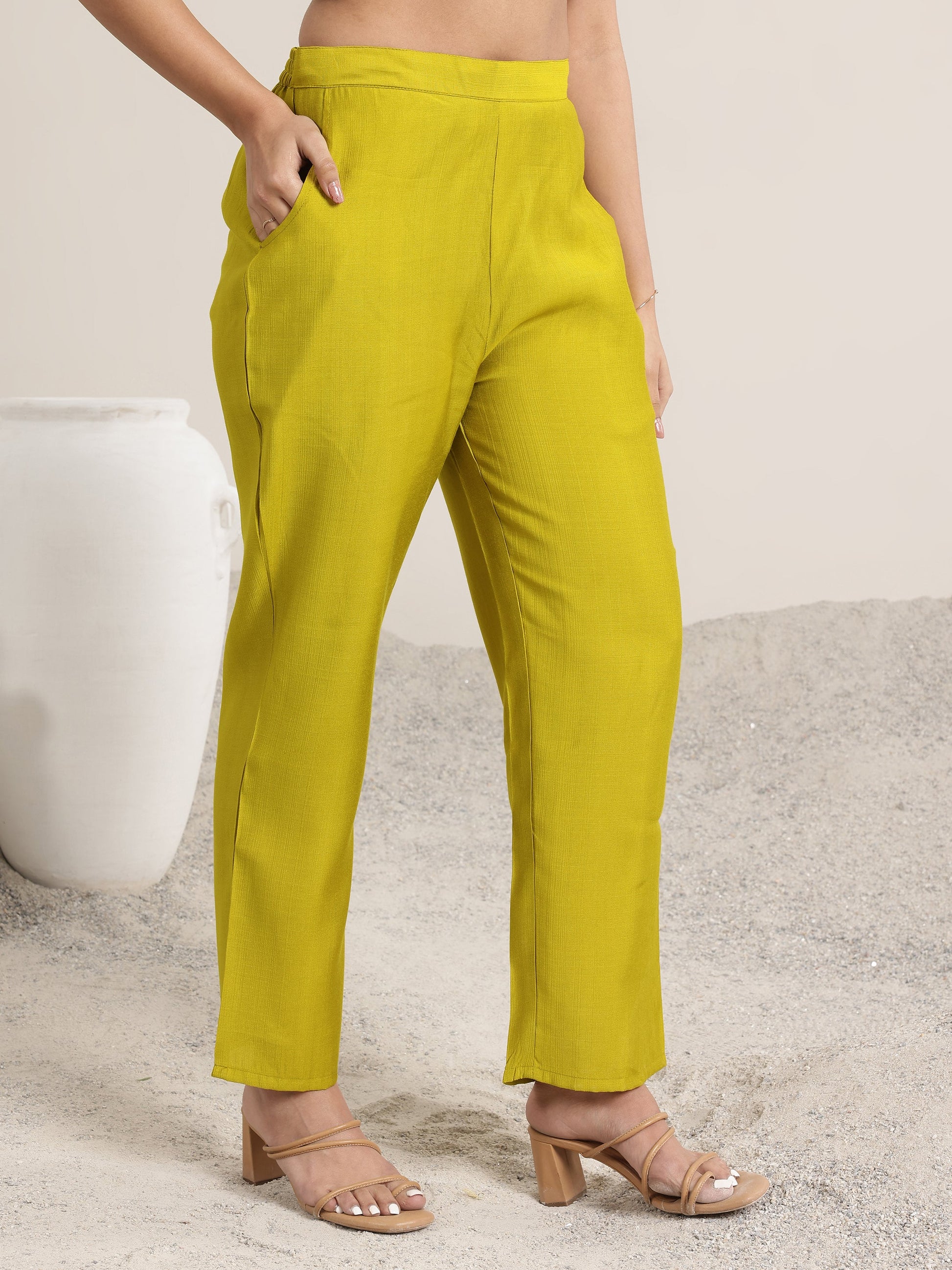 Our 3-piece green yoke design silk blend straight suit set features a kurta with a round neckline, three-quarter sleeves, and statement yoke. Complemented with a solid trousers with a partially elasticated waistband and roomy pockets, and a dupatta. Highlighted with sequins and threadwork, this style is perfect for light festivities.