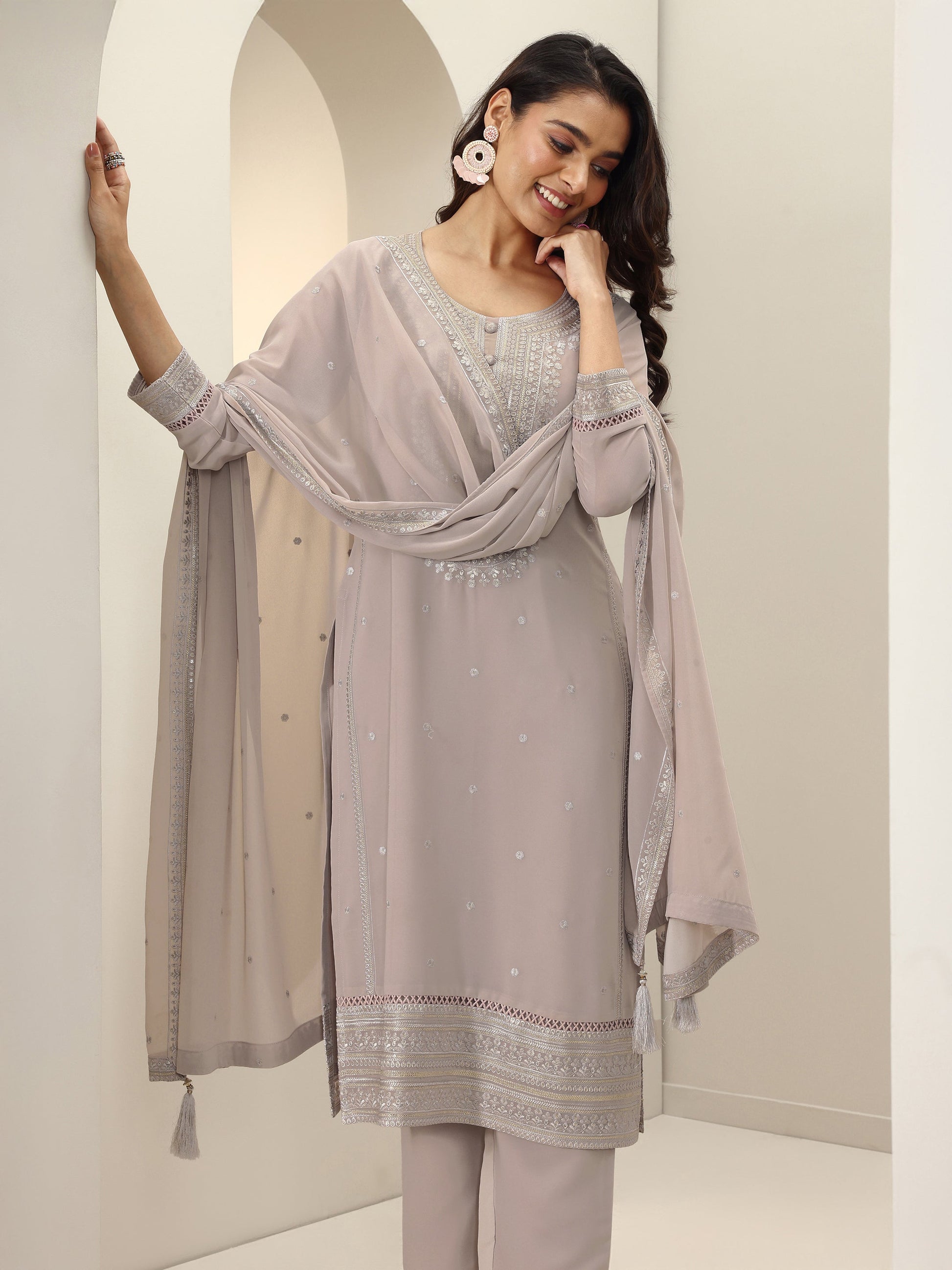 Grey Embroidered Georgette Straight Suit Sets With Dupatta