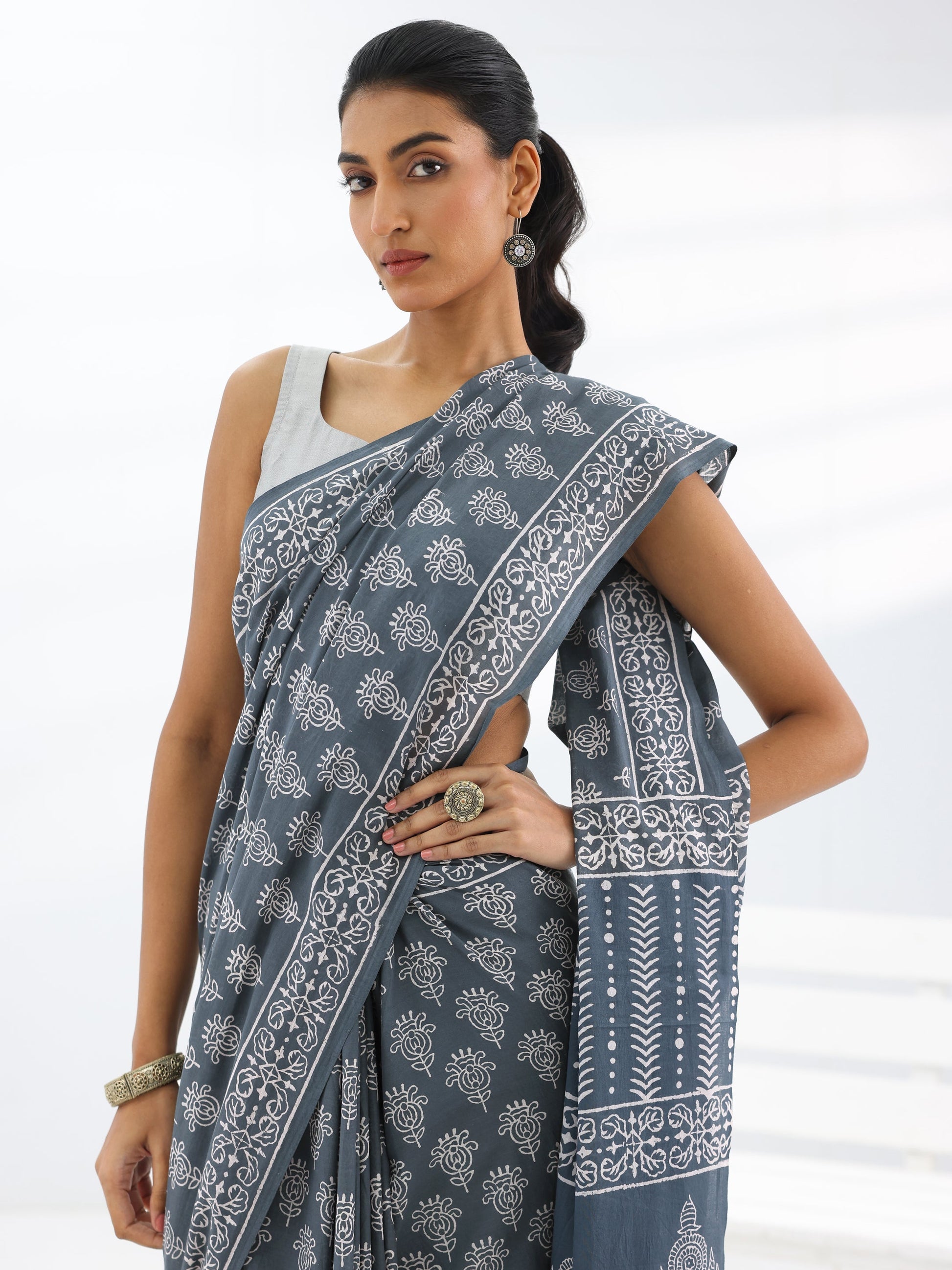 Our Grey Printed Cotton Saree Features Captivating Ethnic Motif Printed Design. Complemented With A Unstitched Blouse. This Charming Saree Is Perfect For Casual Wear