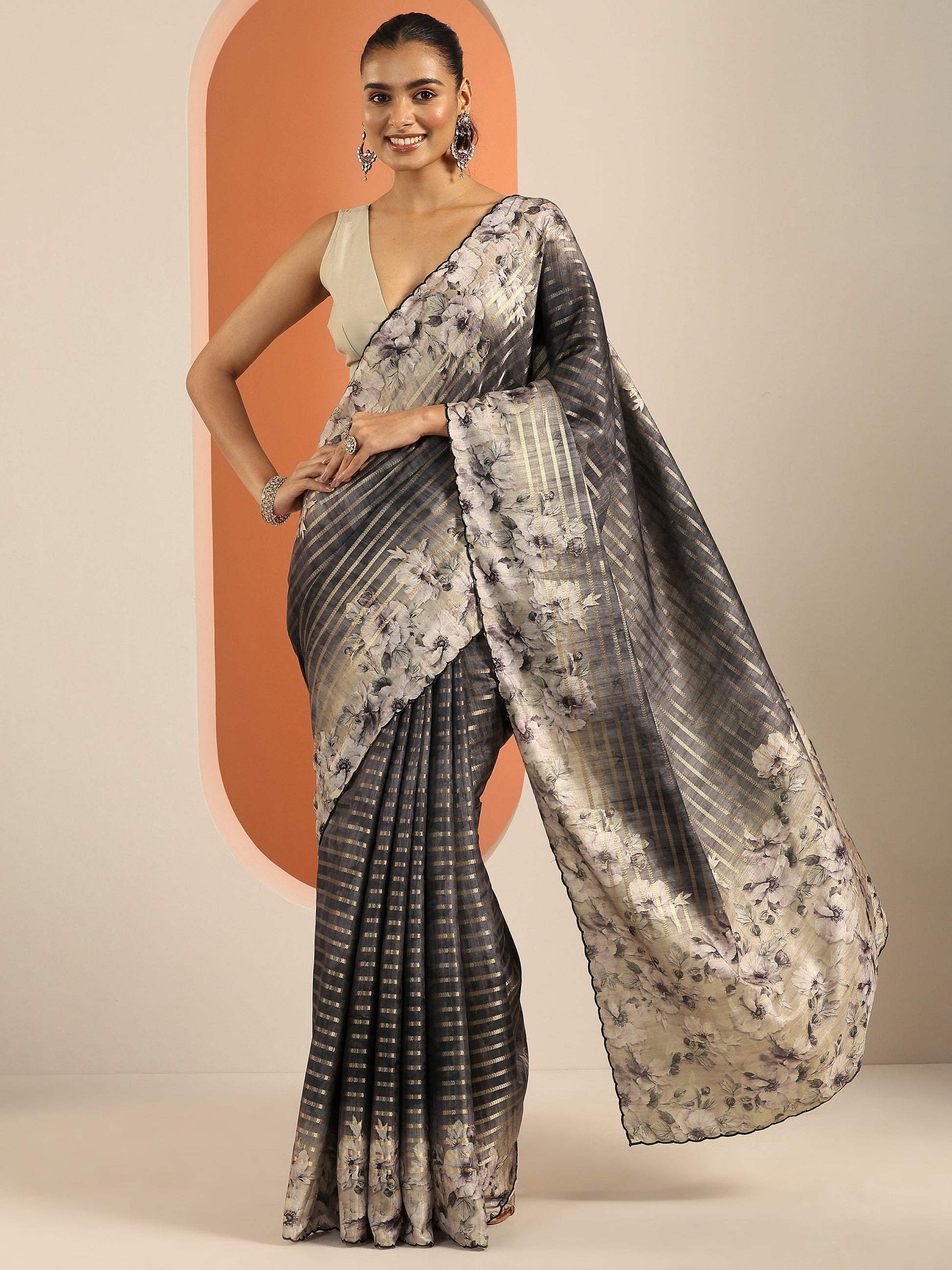 Our Grey Printed Silk Blend Saree Features Captivating Floral Printed Design. Complemented With A Unstitched Blouse Piece. This Charming Saree Is Perfect For Festive Wear.