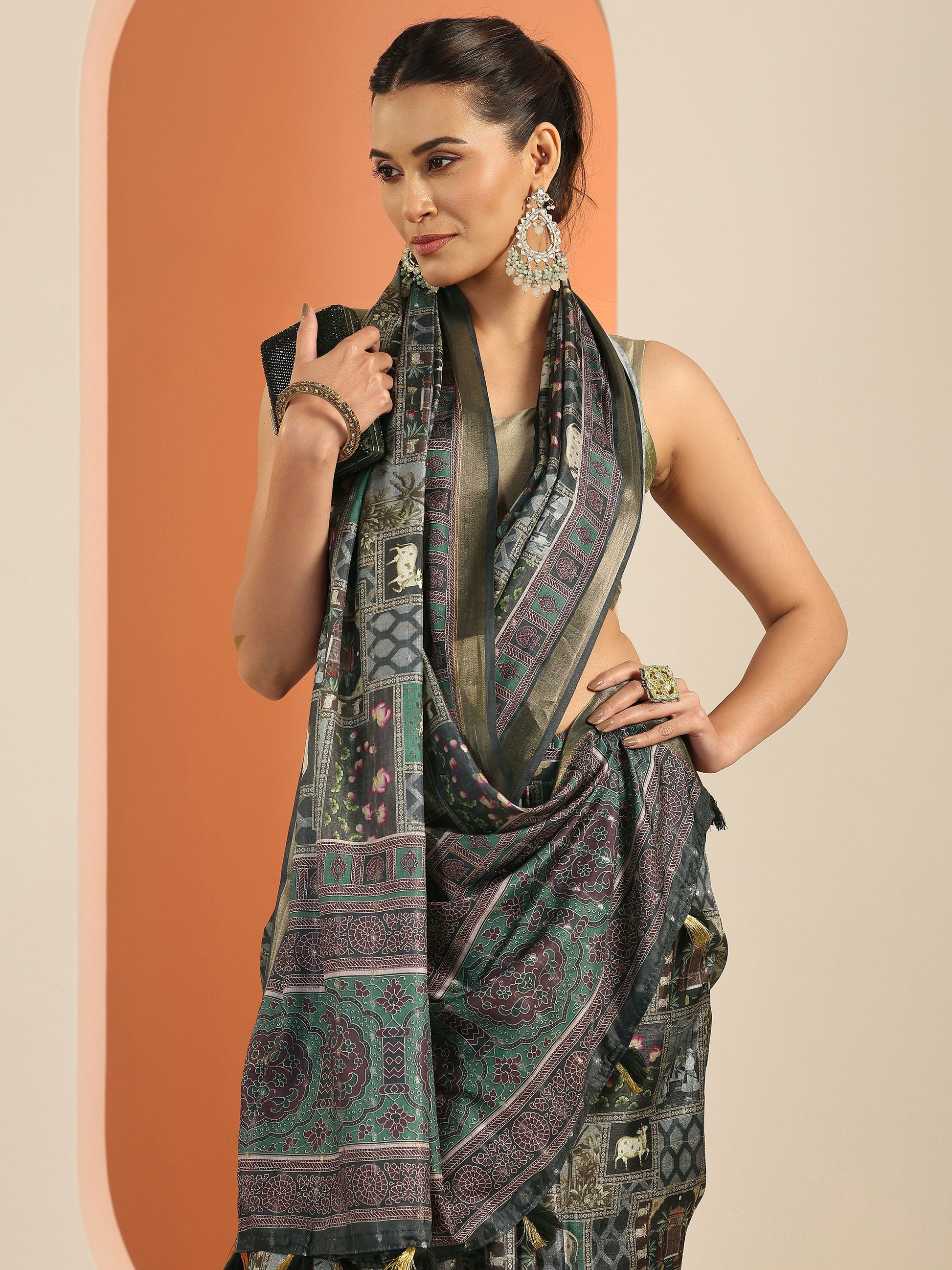 Grey Printed Silk Blend Saree With Unstitched Blouse Piece