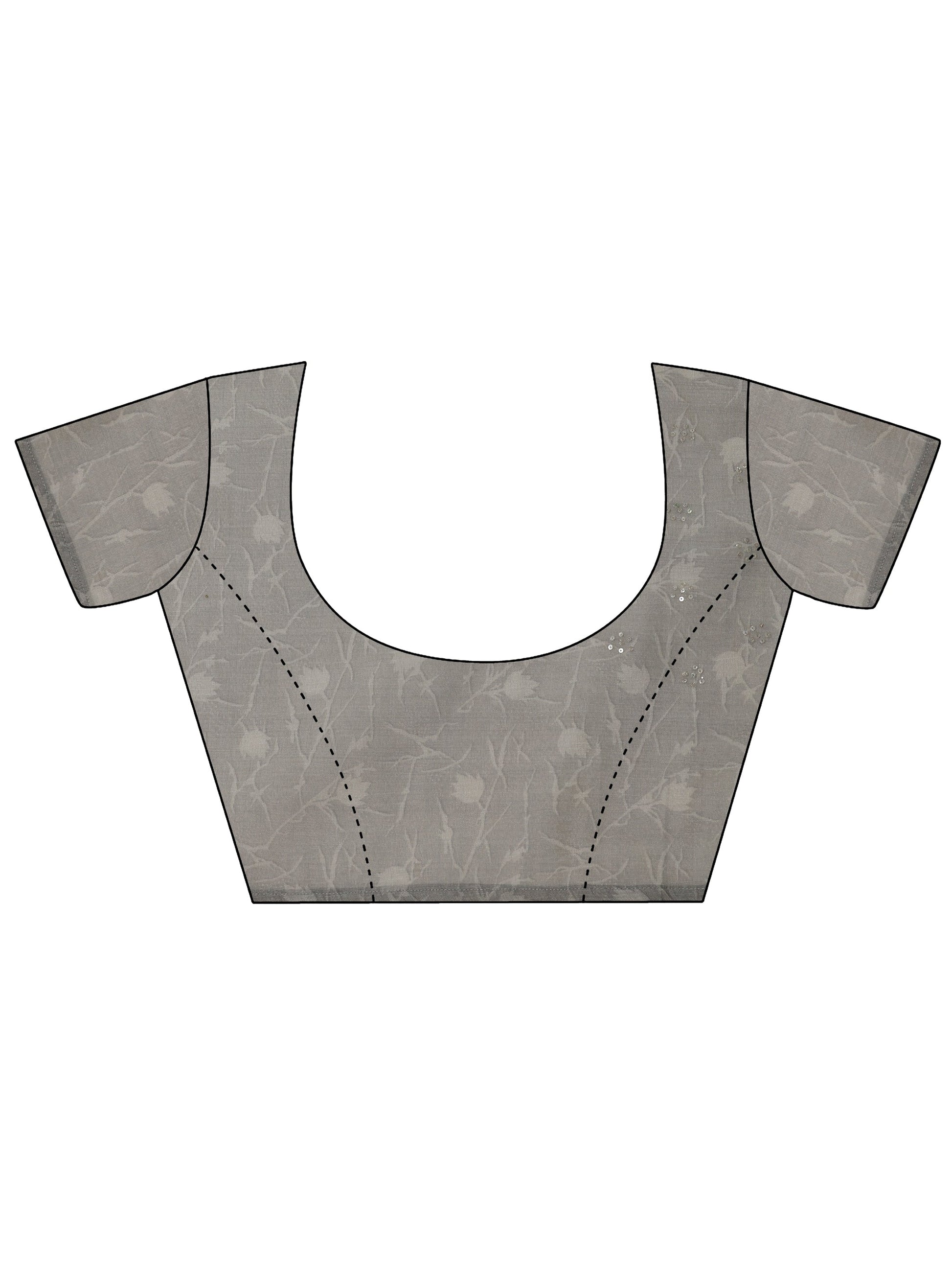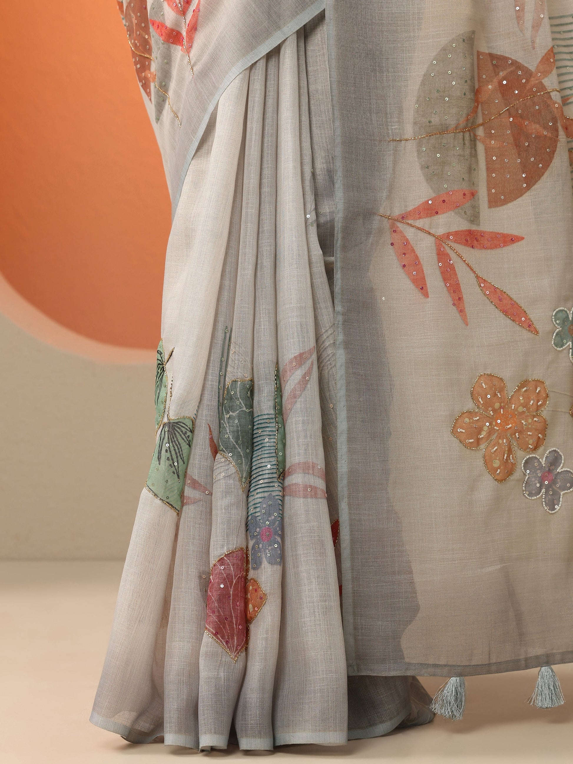 Grey Printed Silk Blend Saree With Unstitched Blouse Piece