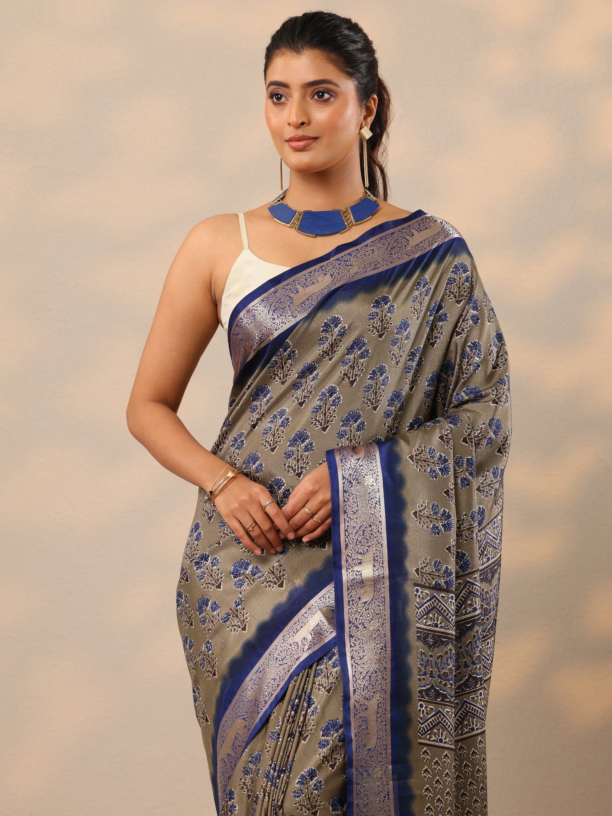 Grey Printed Silk Blend Sarees With Unstitched Blouse Piece