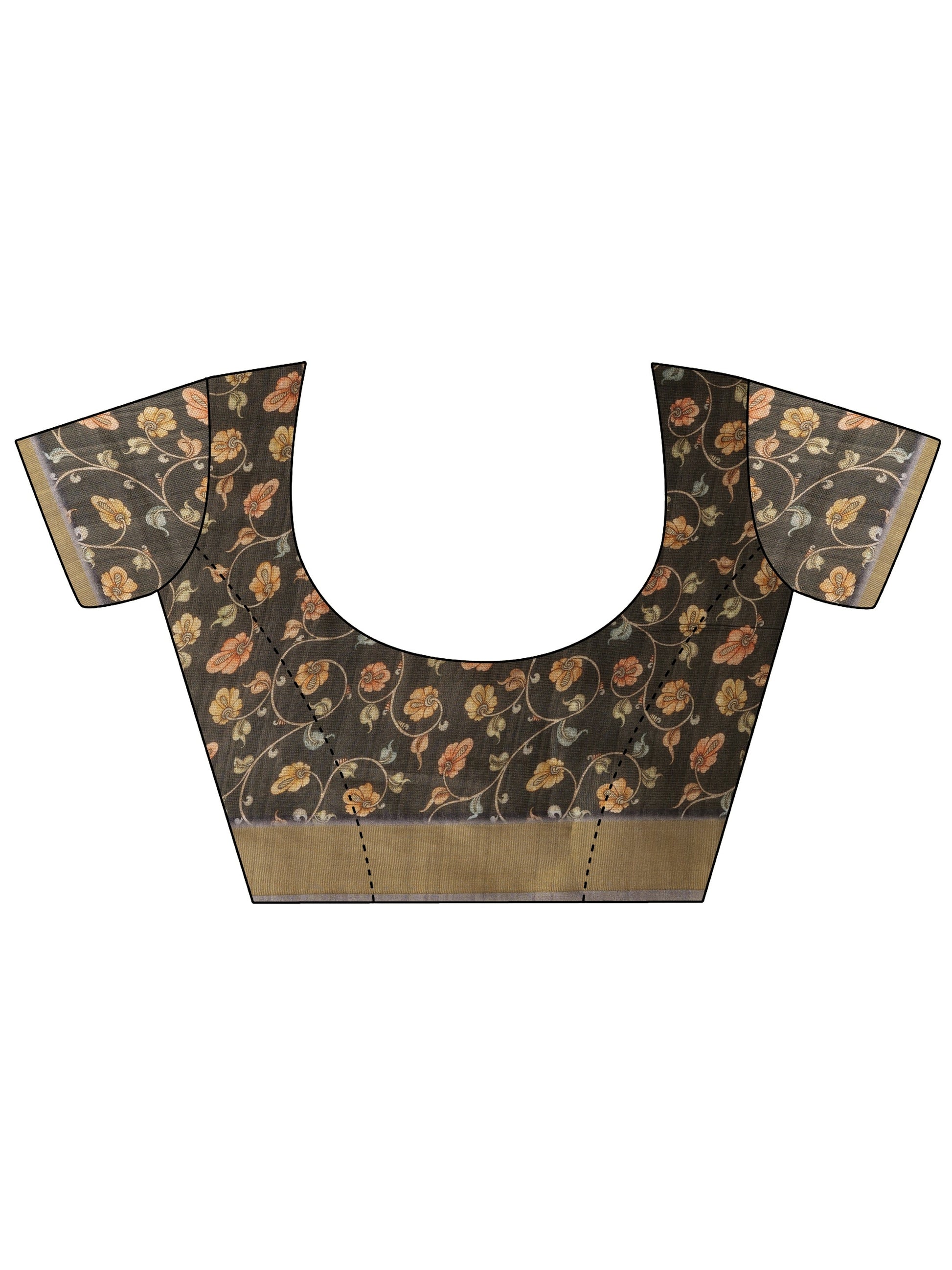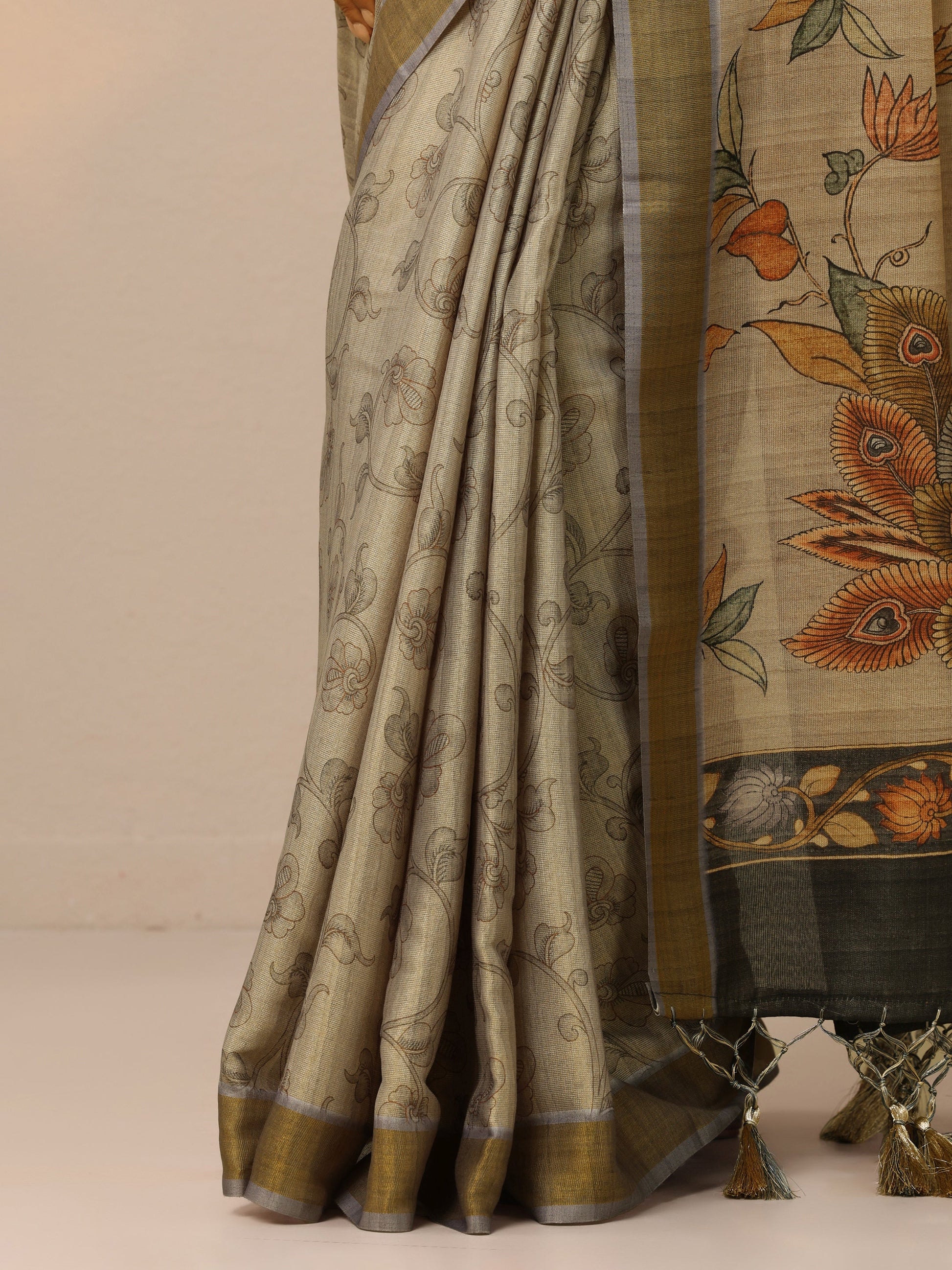 Grey Printed Silk Blend Sarees With Unstitched Blouse Piece