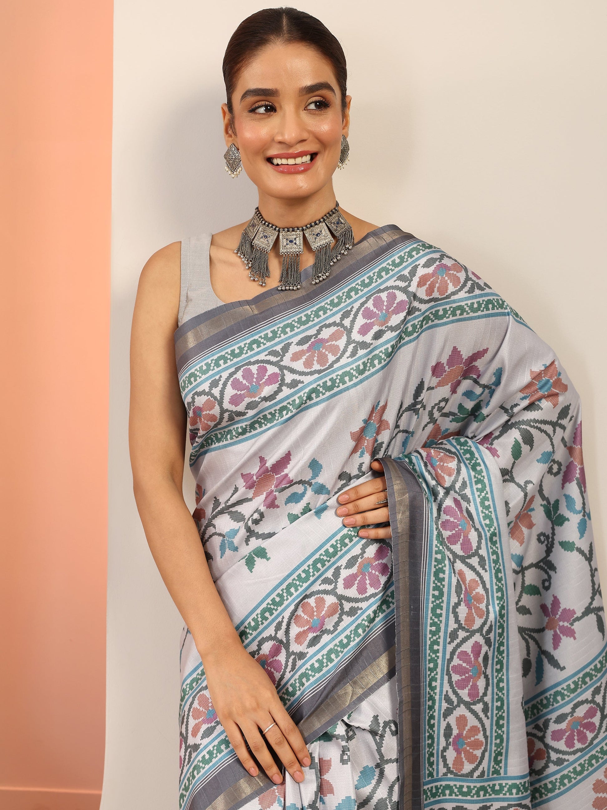 Grey Printed Silk Saree With Unstitched Blouse Piece