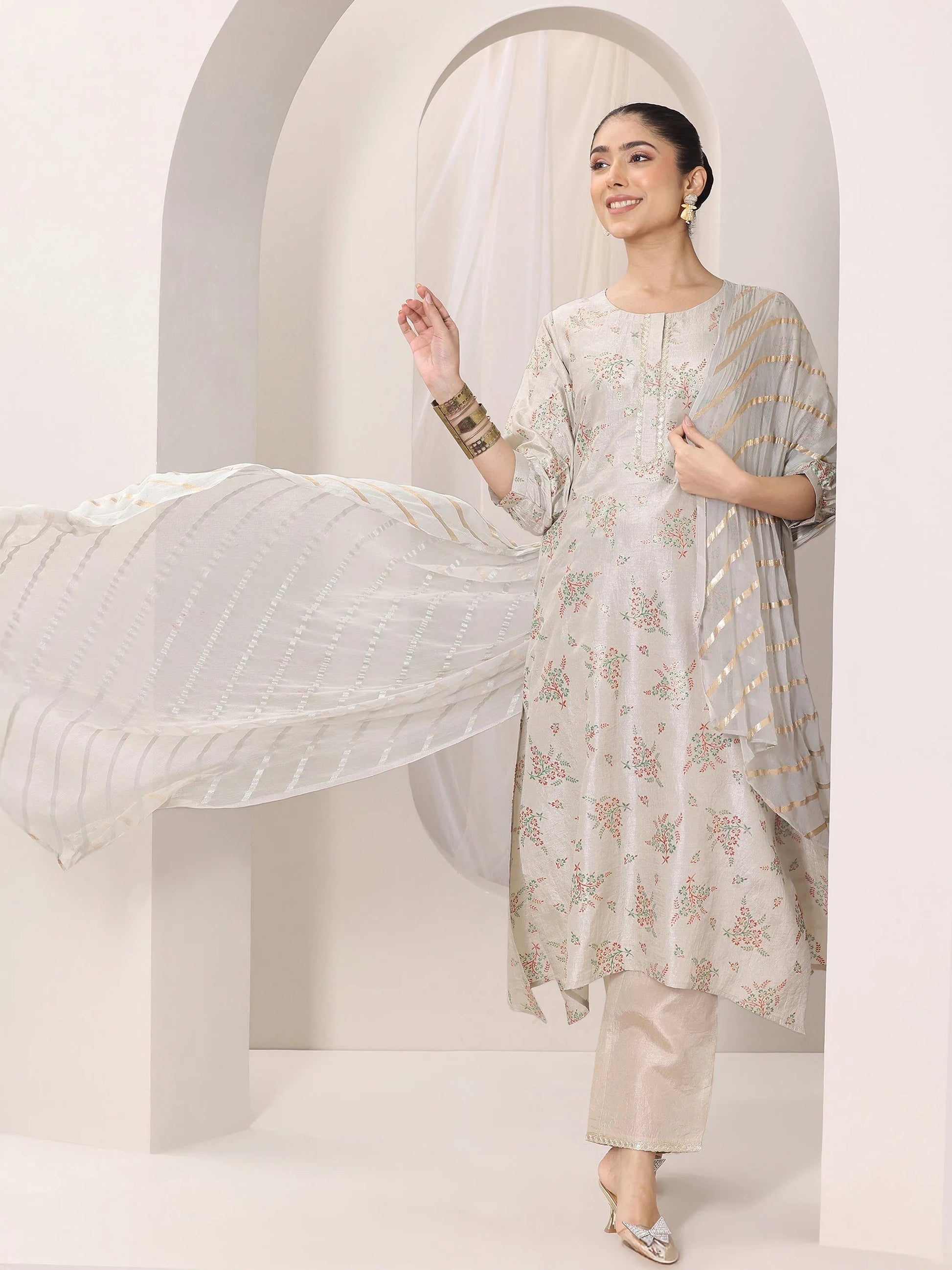 Grey Woven Design Silk Blend Straight Suit Set With Dupatta