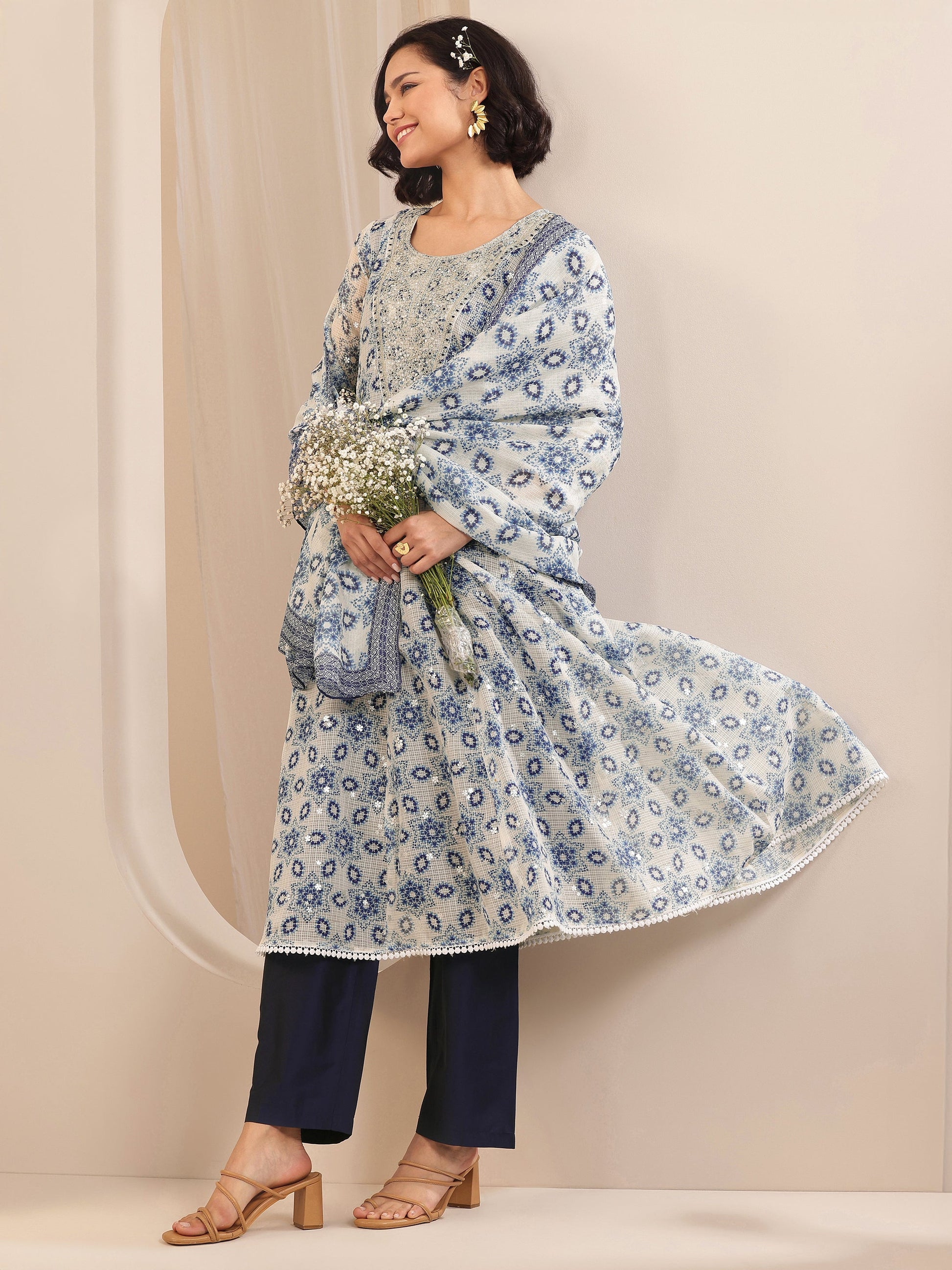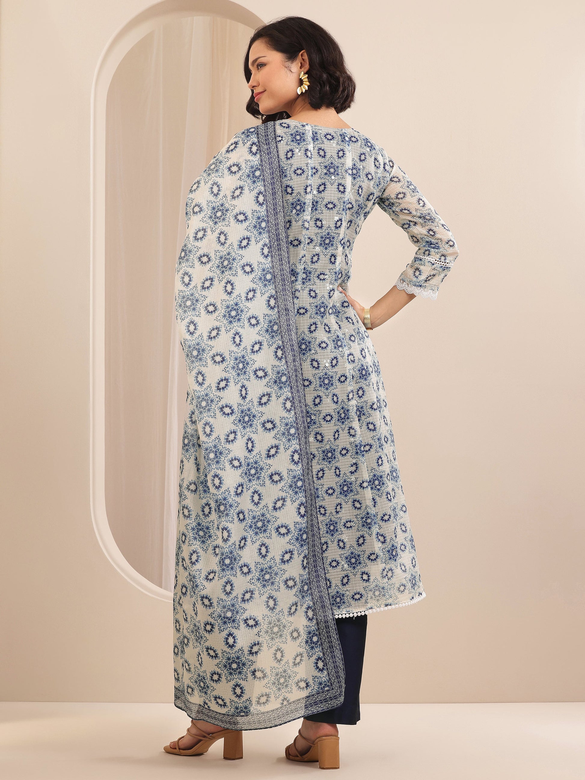 Indigo Printed Silk Blend A-line Suit Sets With Dupatta