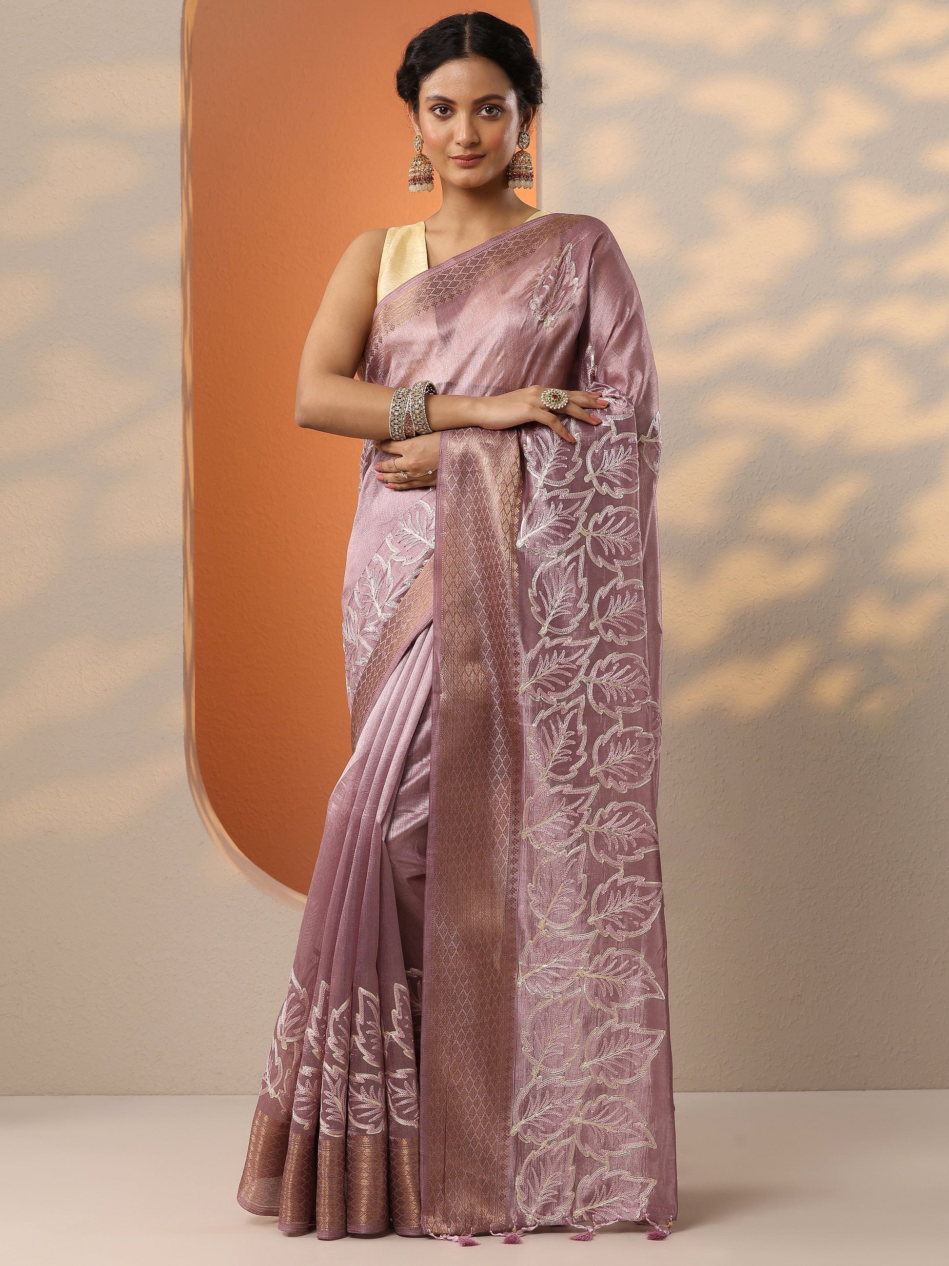 Our lavender printed silk blend saree features captivating leaf print. Complemented with a blouse piece. This charming saree is perfect for festive occasions.
