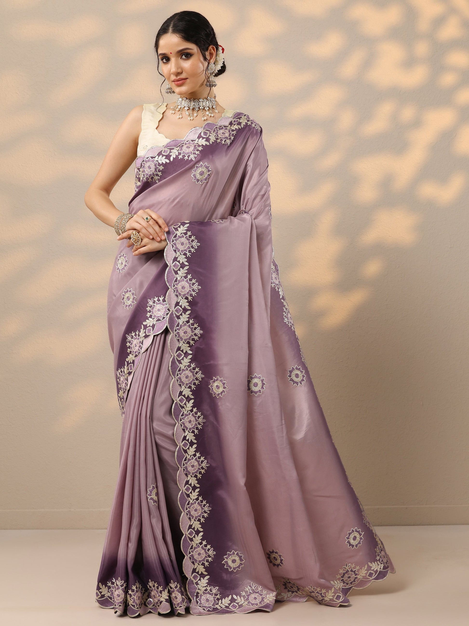 Lavender Embroidered Silk Blend Saree With Unstitched Blouse Piece