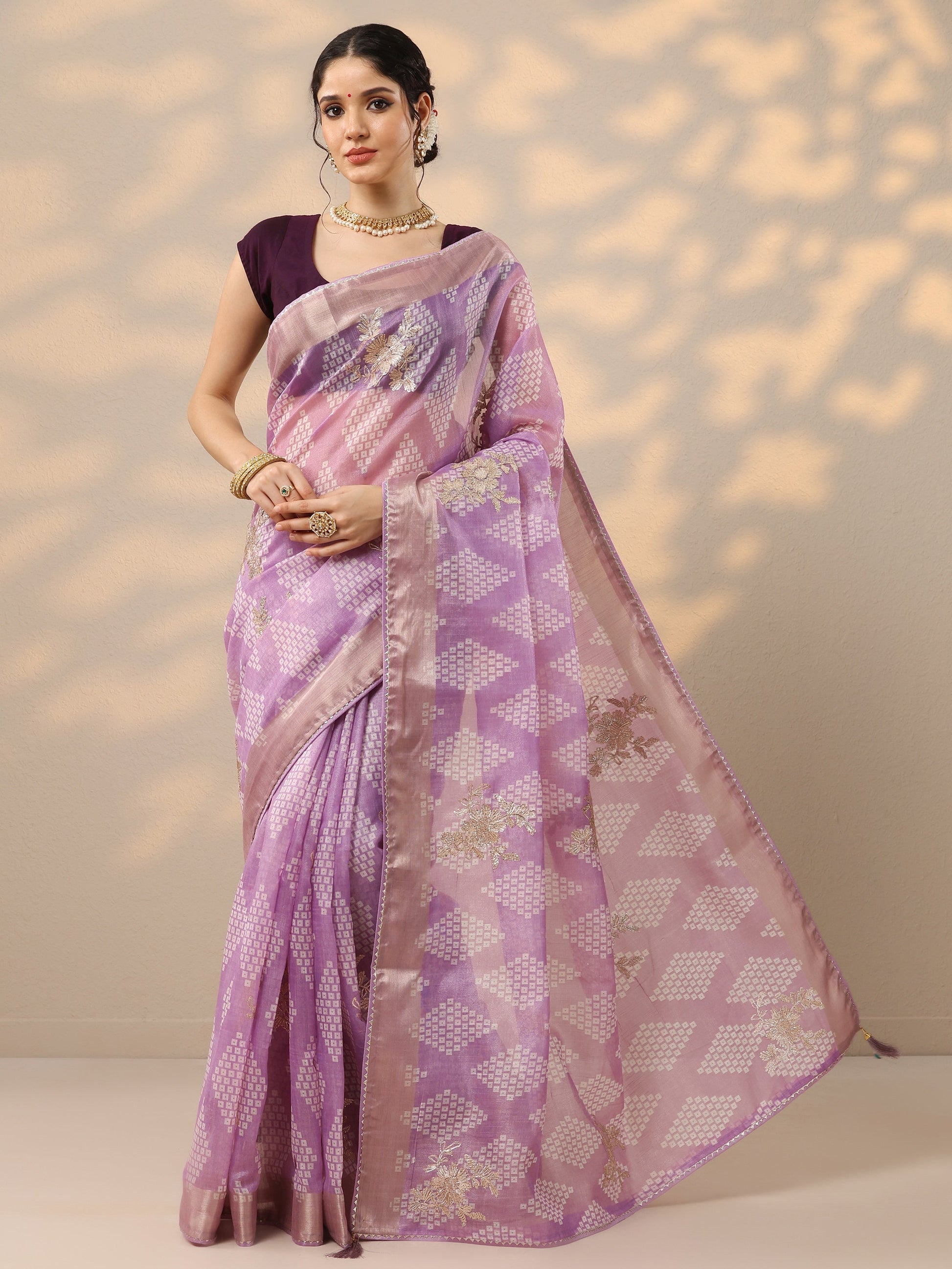 Our Lavender Printed Silk Blend Saree Features Captivating Geometric And Floral Prints. Complemented With An Unstitched Blouse Piece. This Charming Saree Is Perfect For Festive Occasions