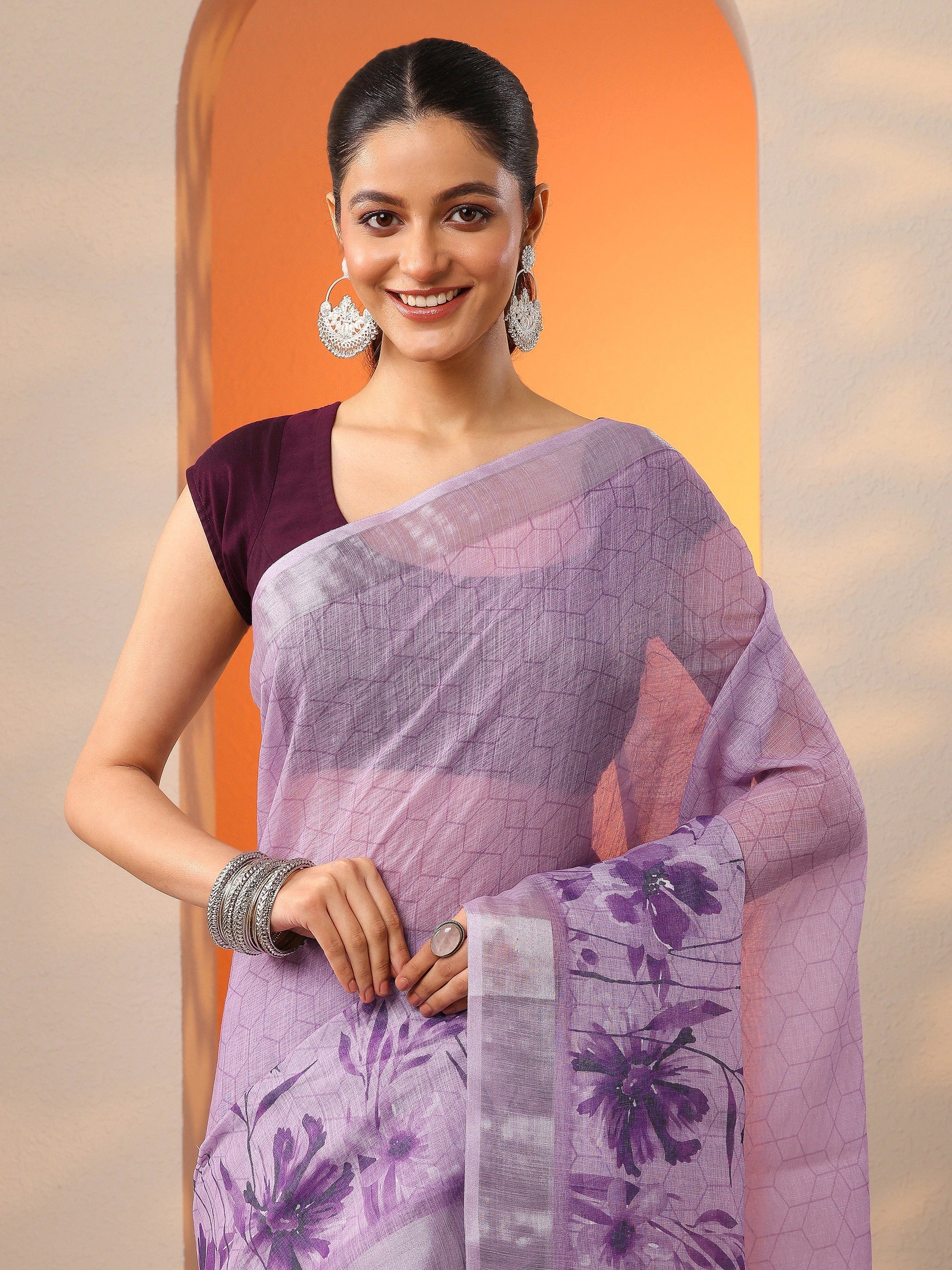 Lavender Printed Cotton Blend Saree With Unstitched Blouse Piece