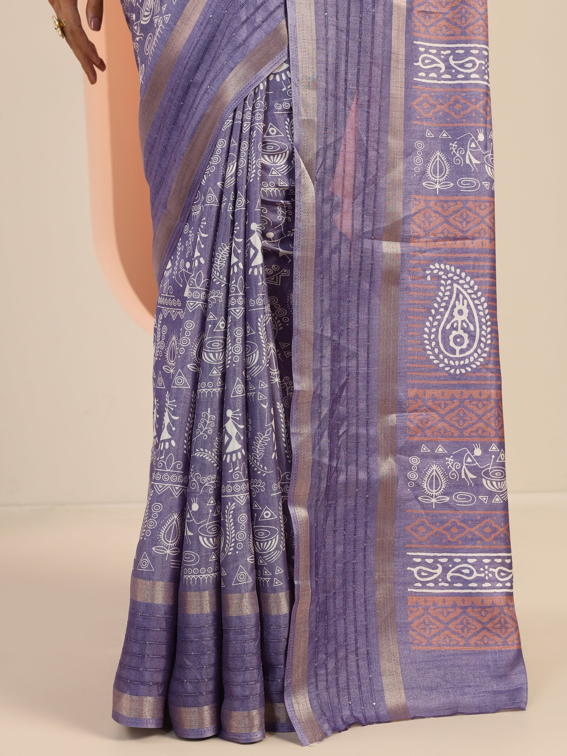 Our Purple Printed Silk Blend Saree Features Captivating Tribal Printed Design. Complemented With An Unstitched Blouse Piece. This Charming Saree Is Perfect For Festive Wear