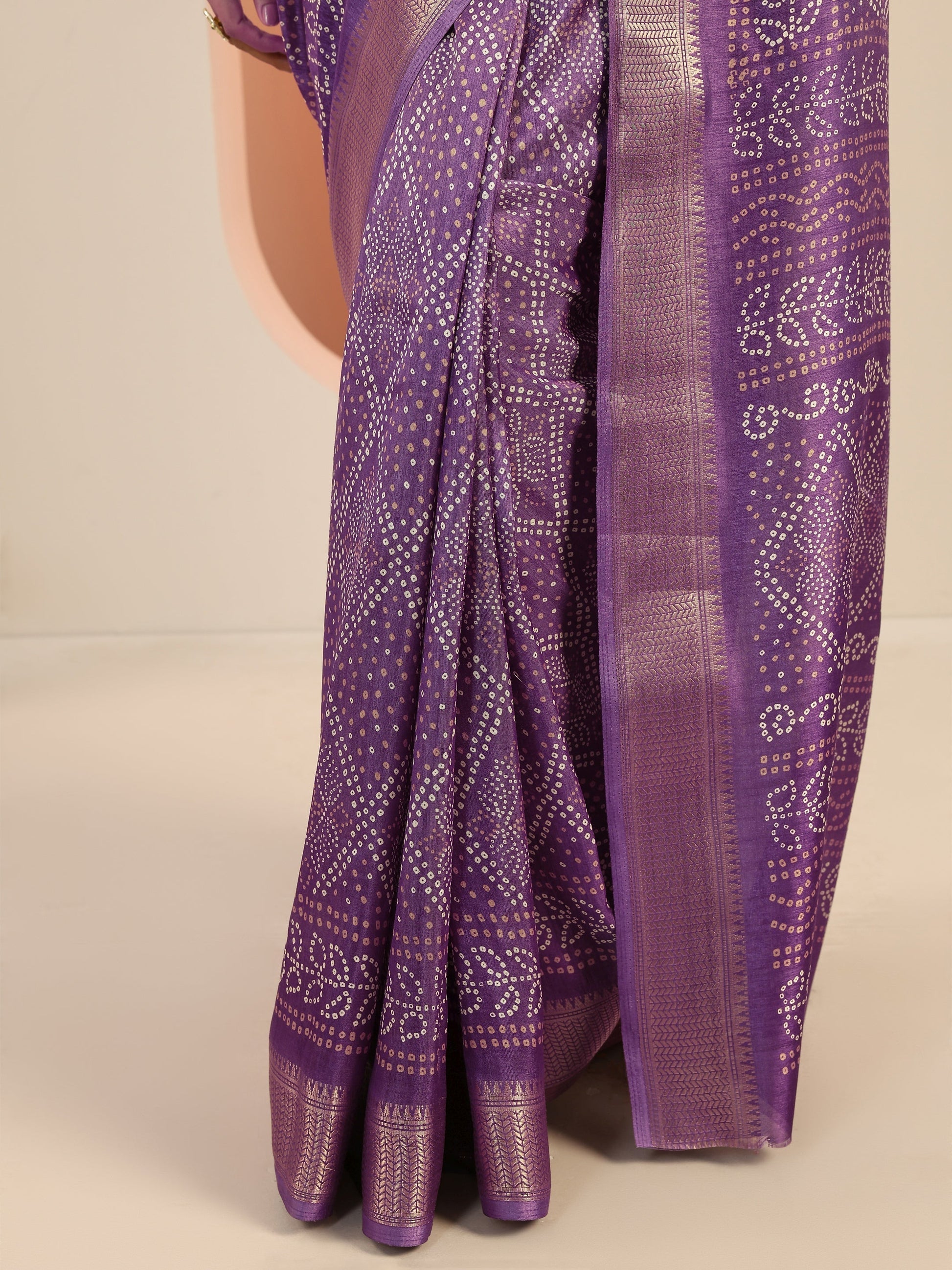 Our Purple Printed Silk Blend Saree Features Captivating Bandhani Printed Design. Complemented With An Unstitched Blouse Piece. This Charming Saree Is Perfect For Festive Wear