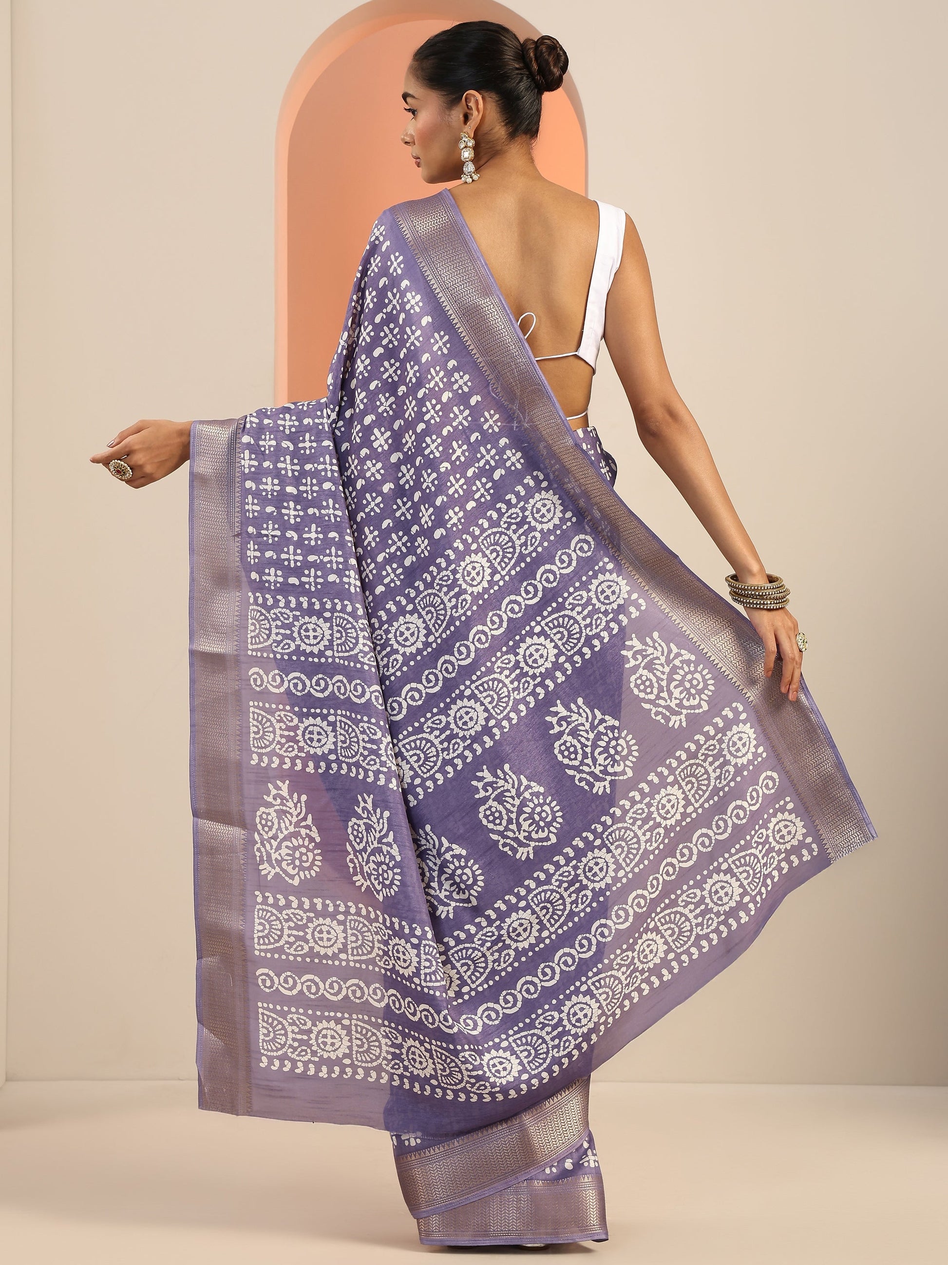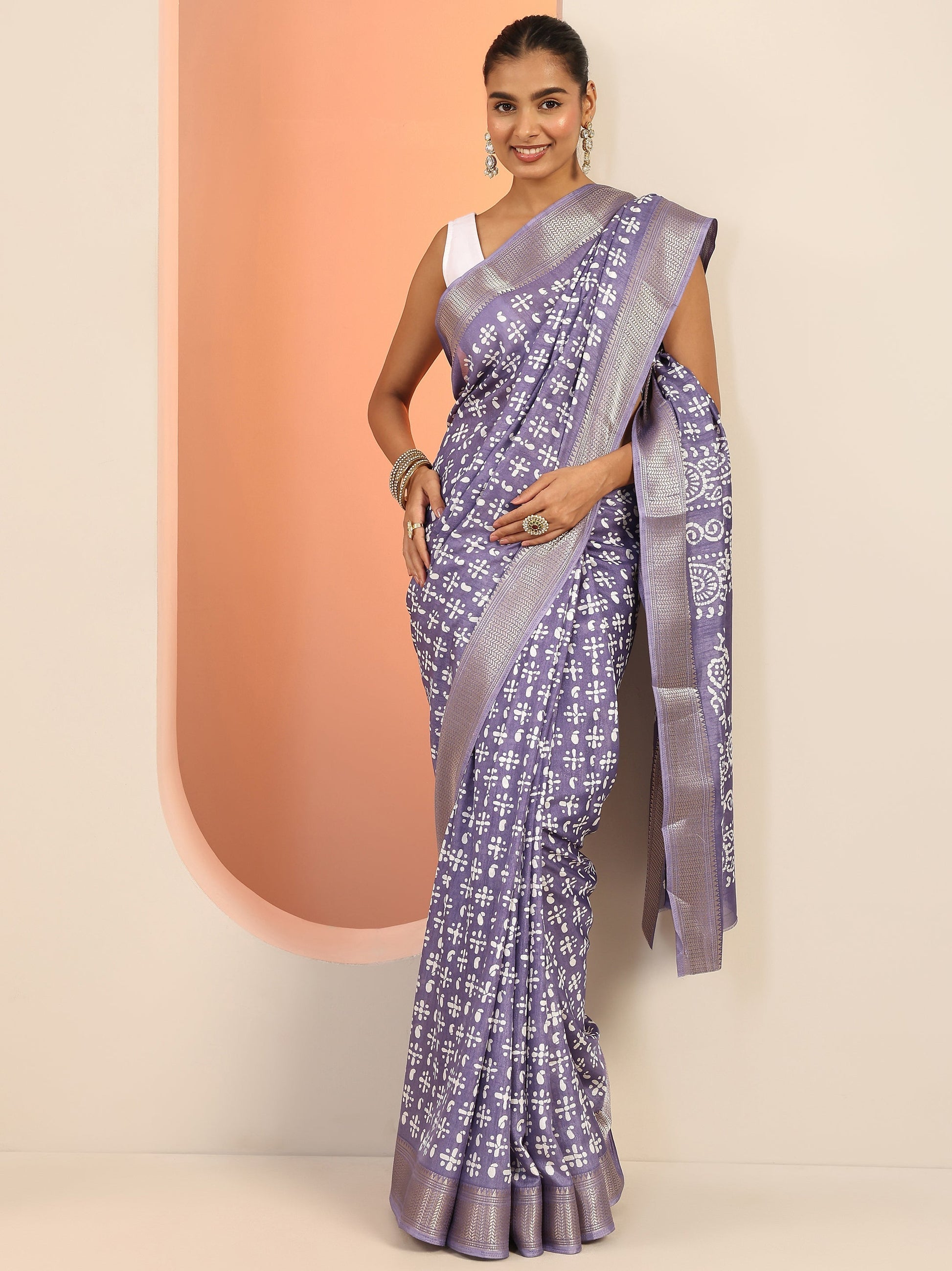 Lavender Printed Silk Blend Saree With Unstitched Blouse Piece
