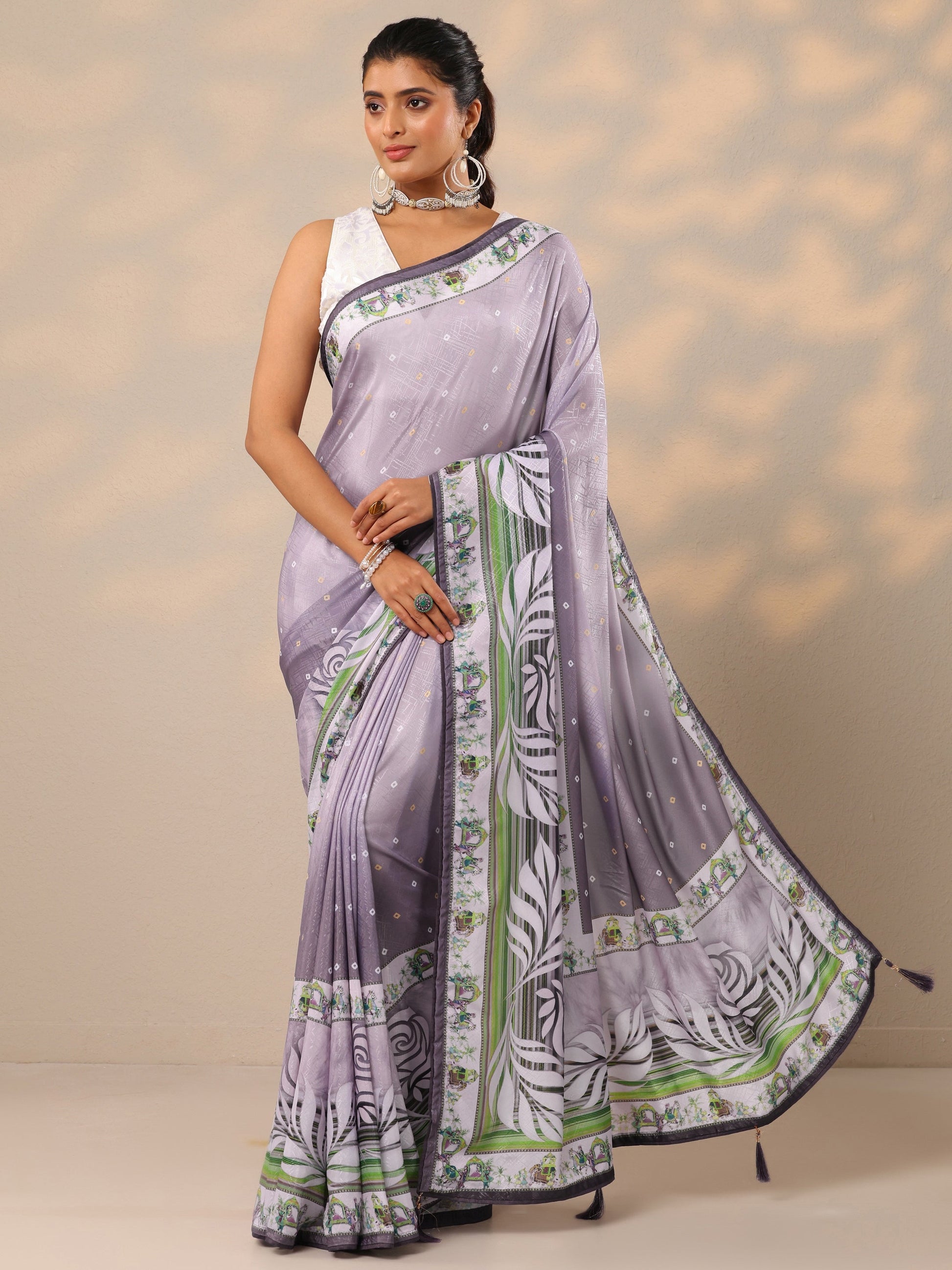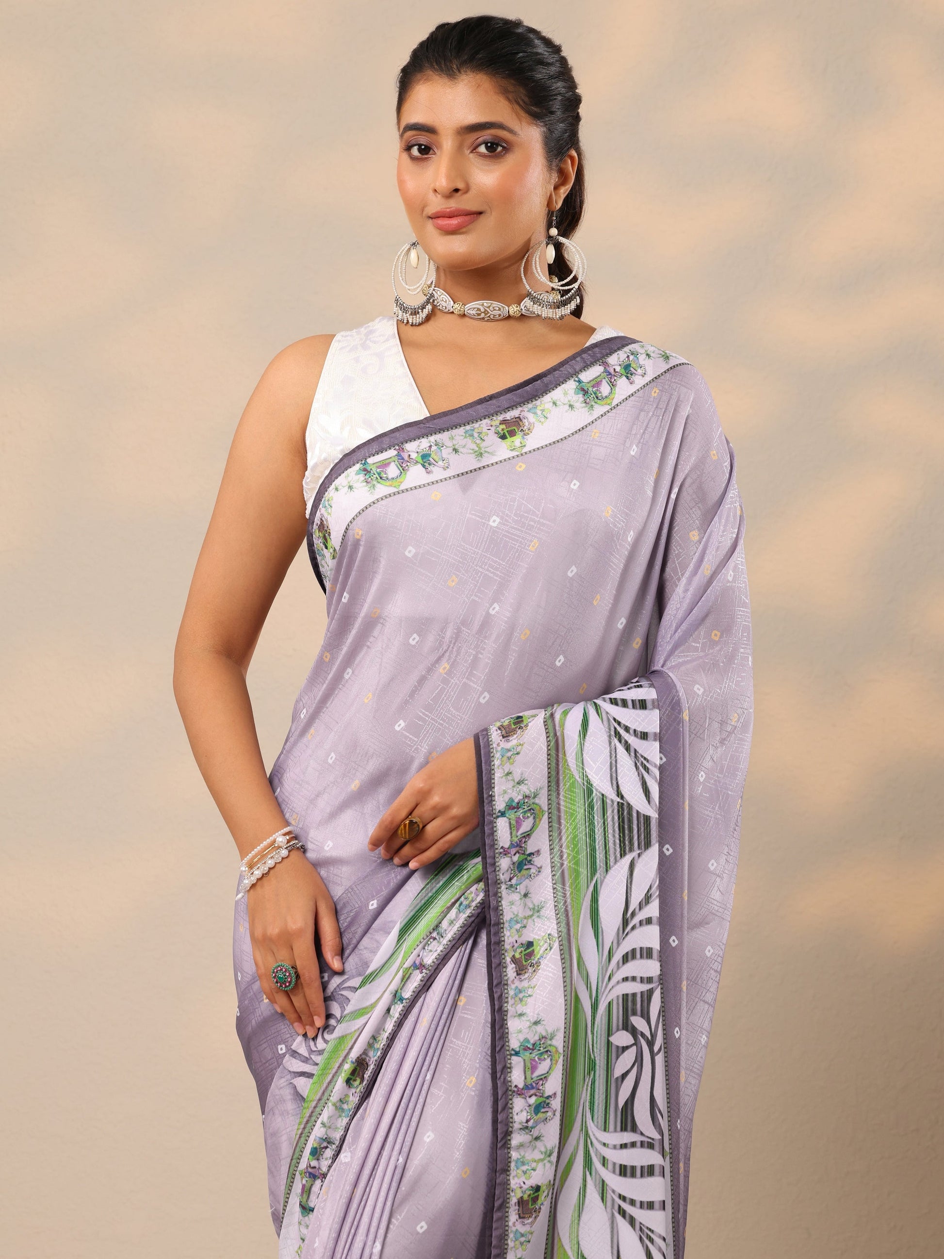 Lavender Printed Silk Blend Sarees With Unstitched Blouse Piece