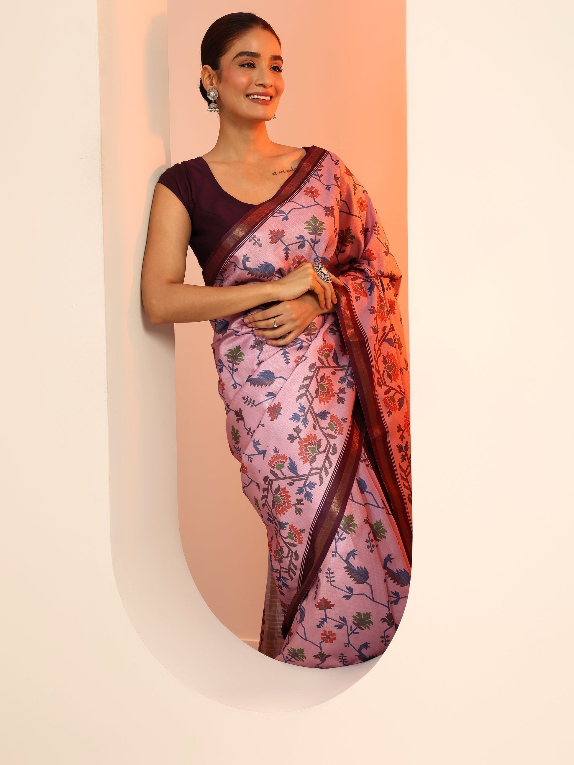 Lavender Printed Silk Saree With Unstitched Blouse Piece