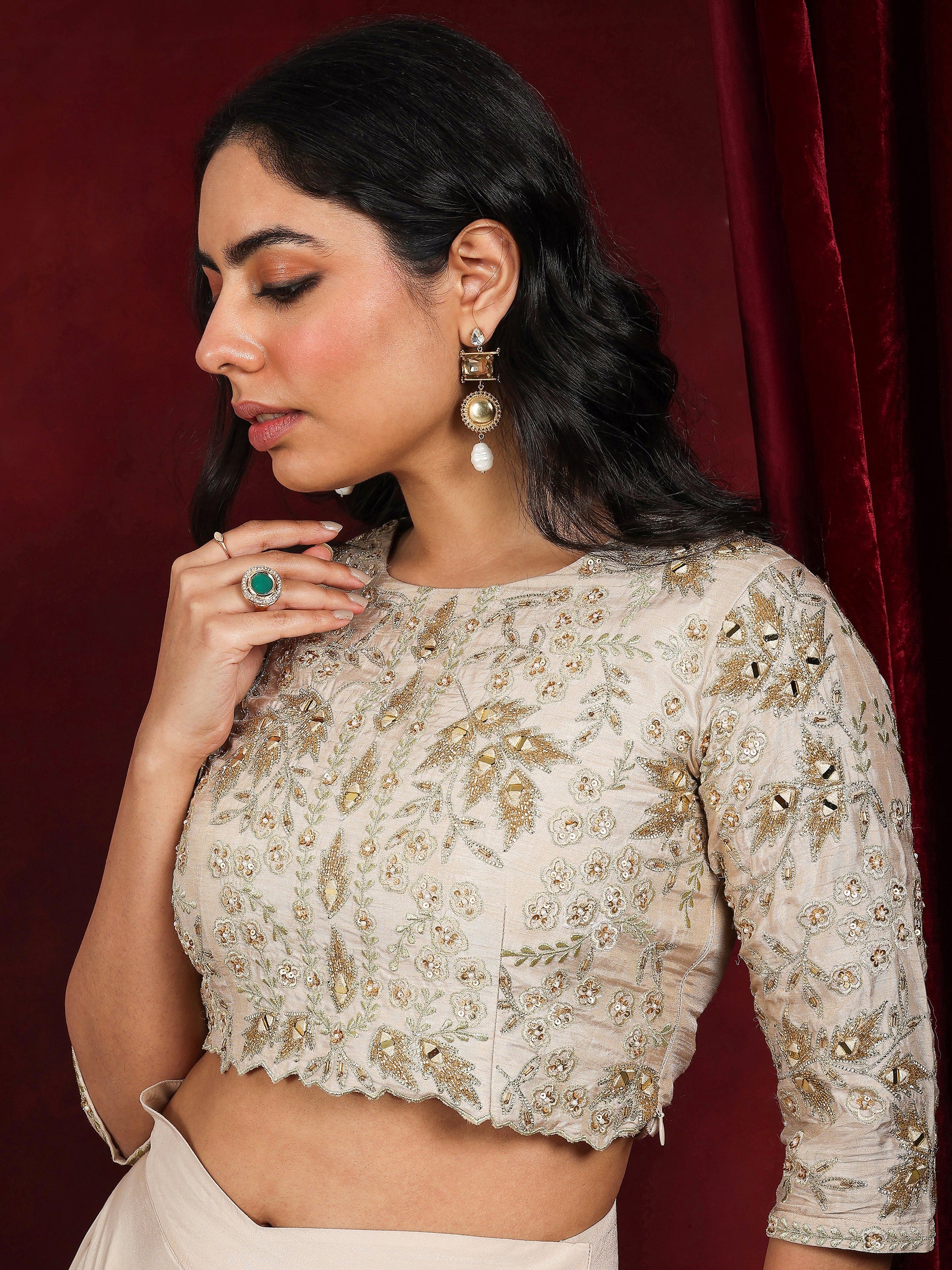 Our 2-piece beige silk blend co-ord set features a straight-fit top with a round neck neckline and three-quarter sleeves. Complemented with matching palazzos with a partially elasticated waistband. Highlighted with embellished details, this style is perfect for festive occasions.