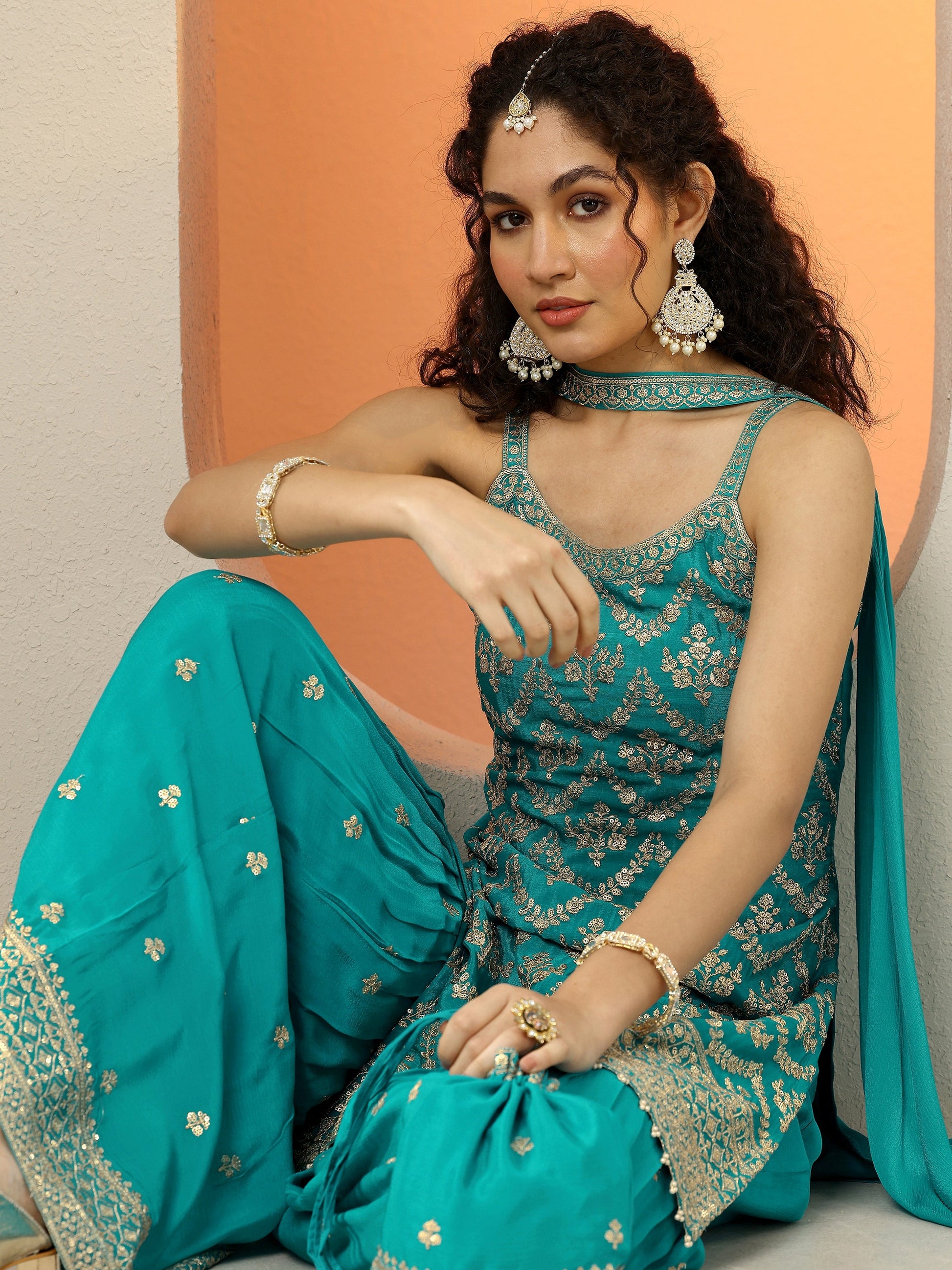 Our 2-piece teal Chinon straight-fit set features a strappy neckline and statement yoke. Complemented with lining and Sharara pants with a partially elasticated waistband, and Embroidered Dupatta. Adorned with Zari Embellished, this style is perfect for festive occasions.