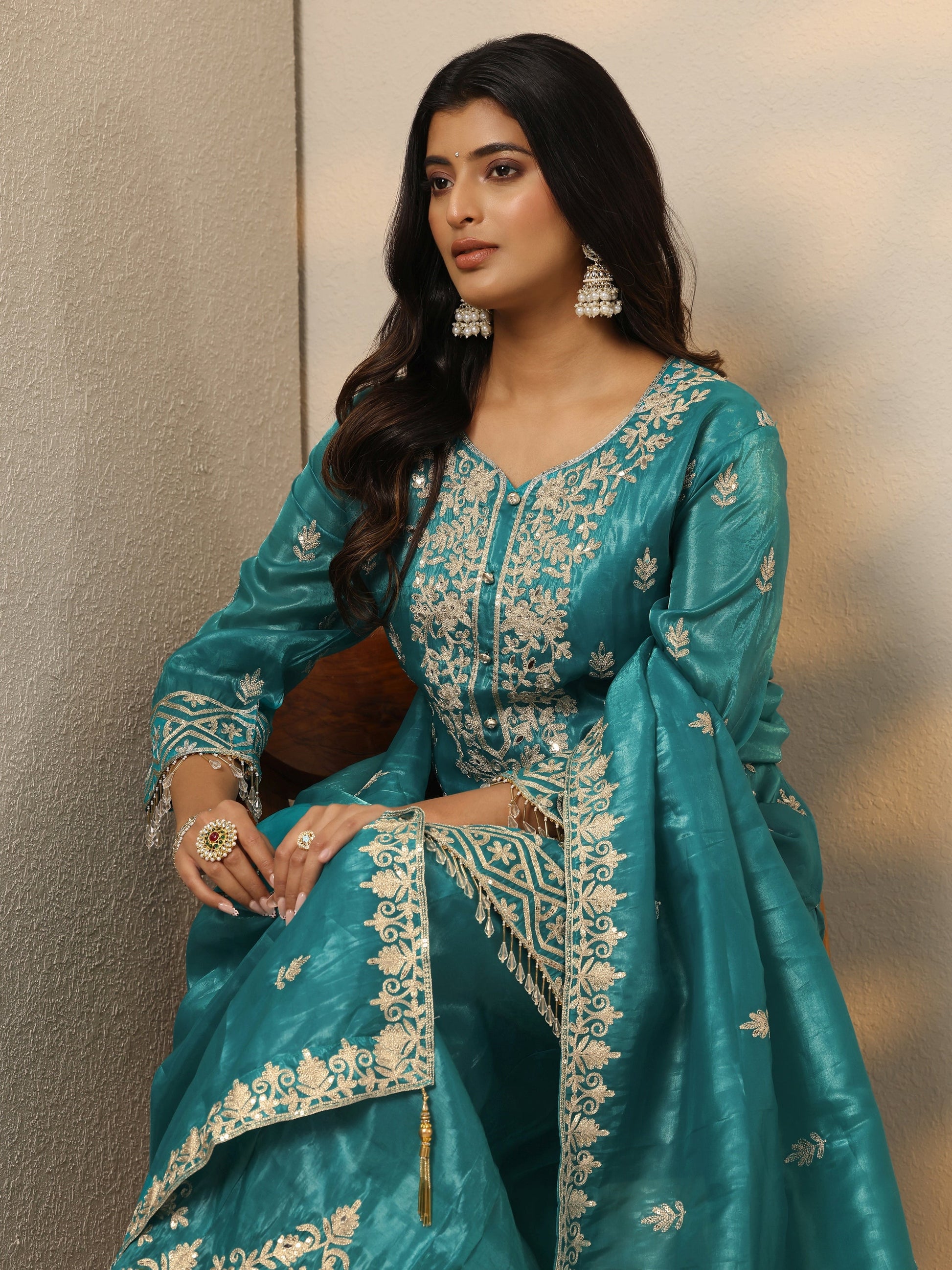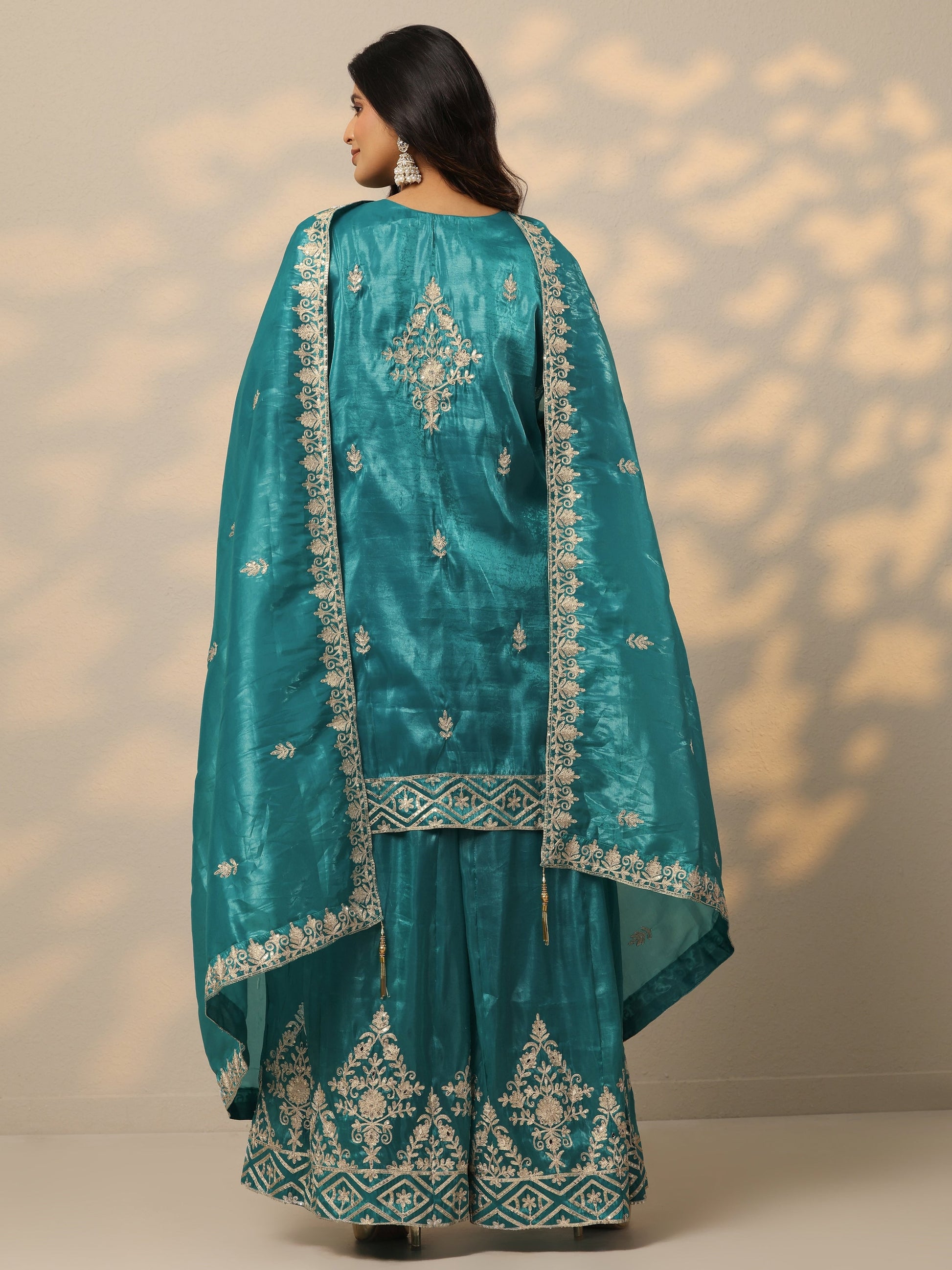 Our 3-piece teal organza kurta set features a straight-fit design with a round neckline, regular sleeves, and a statement yoke. Complemented with sharara pants with a partially elasticated waistband and an embroidered dupatta. Adorned with embroidered accents, this style is perfect for dark festive occasions.