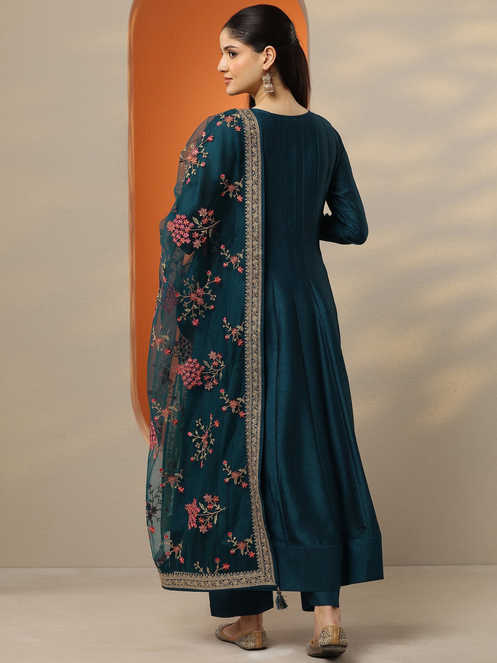 Libas Art Blue Embroidered Silk Blend Anarkali Suit Set With Dupatta