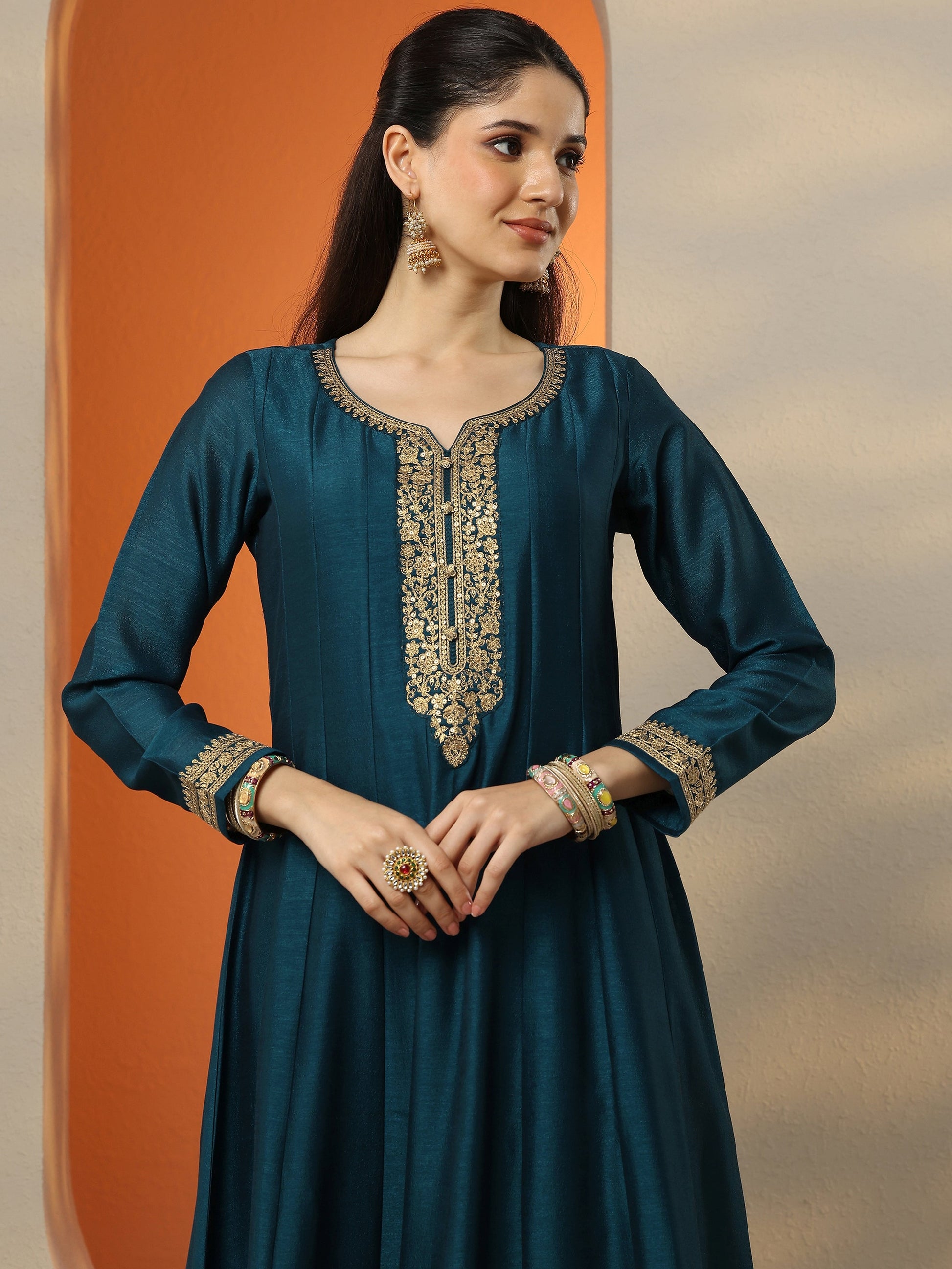 Our 3-piece teal silk blend Anarkali kurta set features a round neckline, regular sleeves, and statement yoke. Complemented with lining and straight pants with a partially elasticated waistband and 2 pockets, and an embroidered dupatta. Adorned with Embroidered, this style is perfect for dark festive occasions.