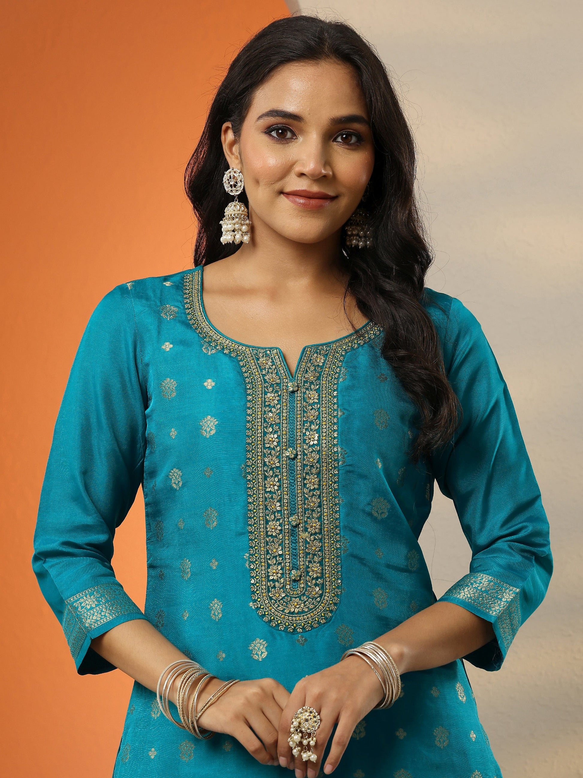 Our 3-piece Teal Silk blend Straight-fit Kurta Set features a Sweetheart Neckline, Regular Sleeves, and statement yoke. Complemented with Straight Pants with a Partially Elasticated waistband and 2 pockets, and a Printed dupatta. Adorned with Embroidered, this style is perfect for Festive occasions.