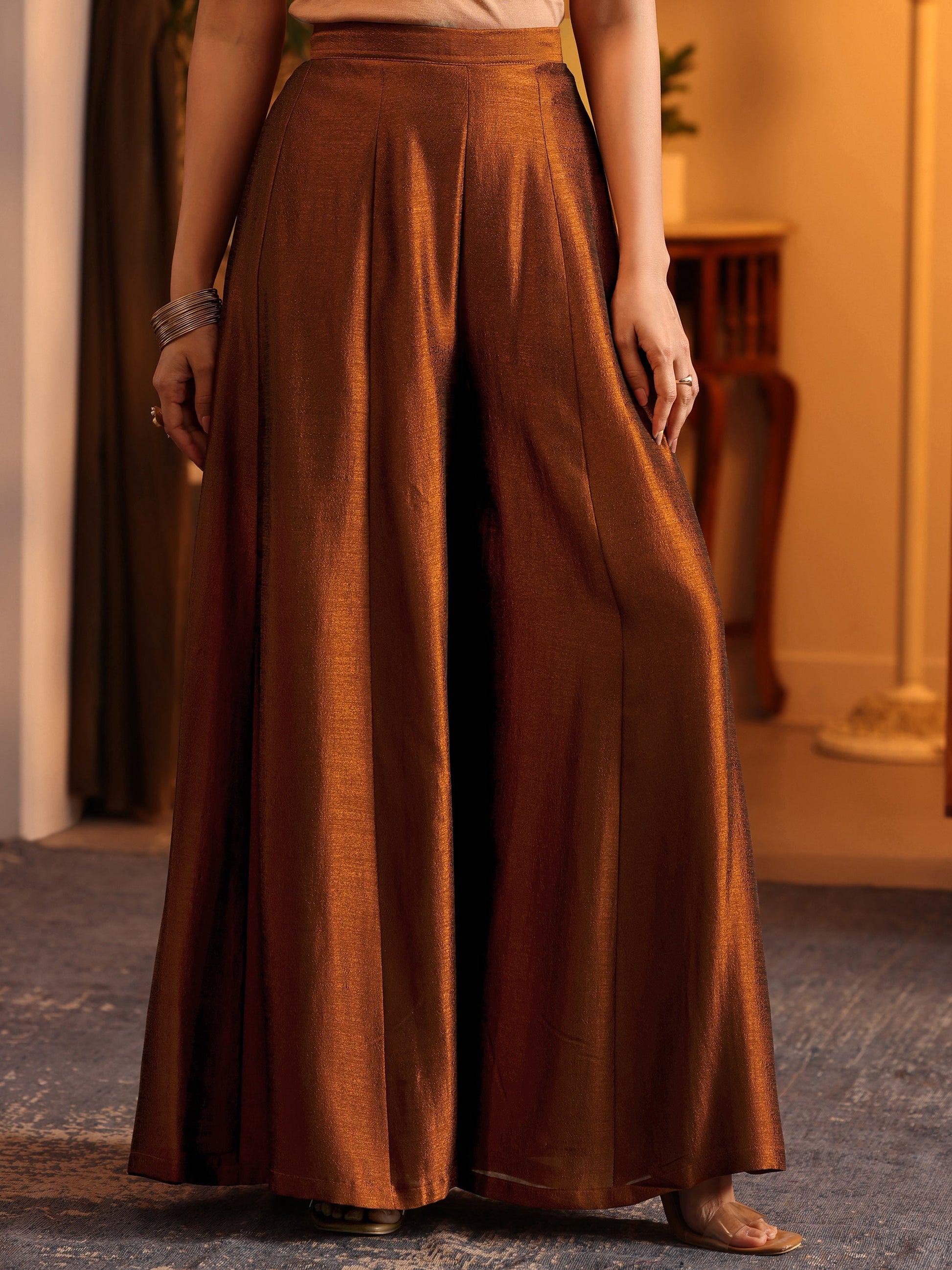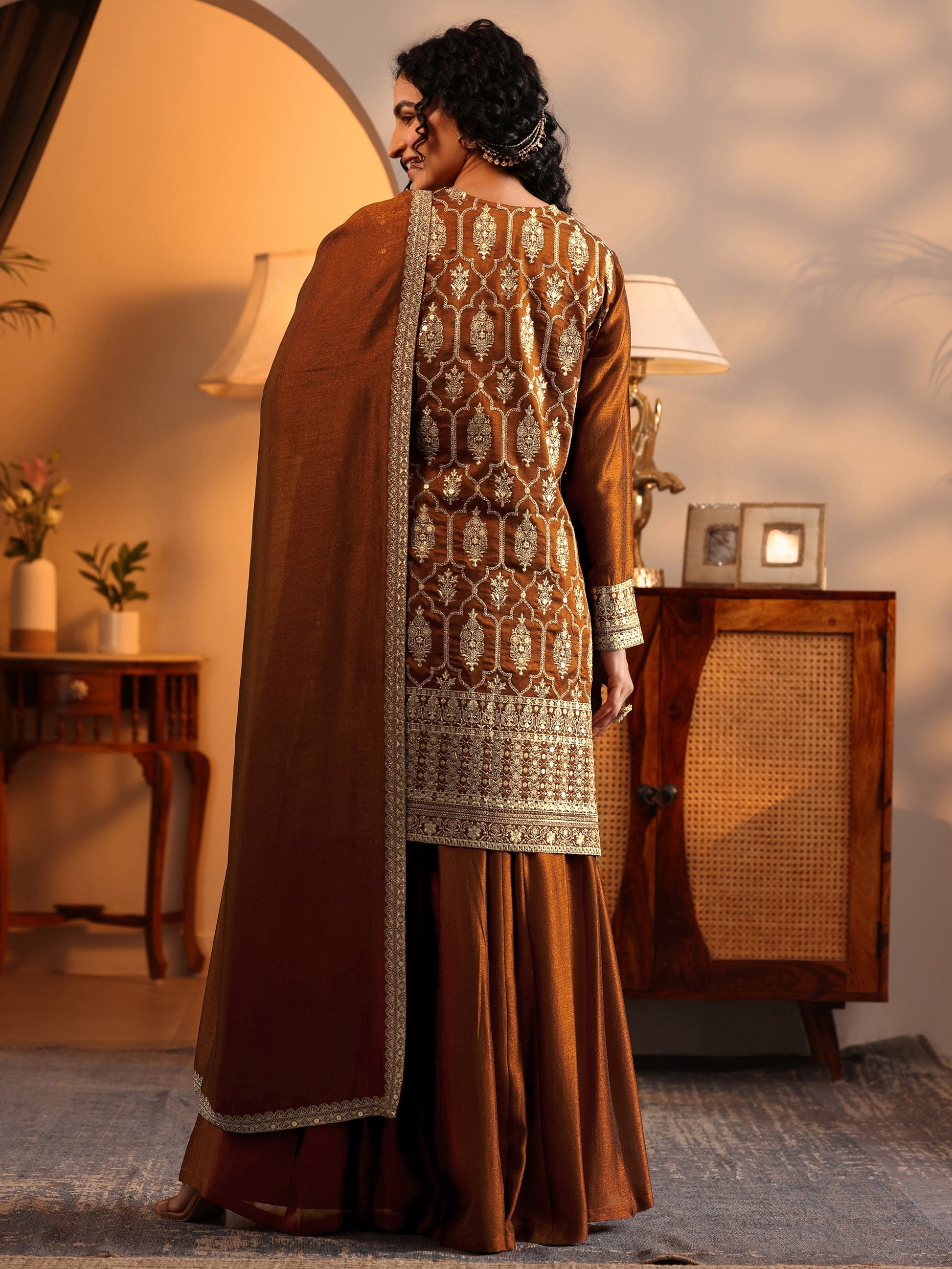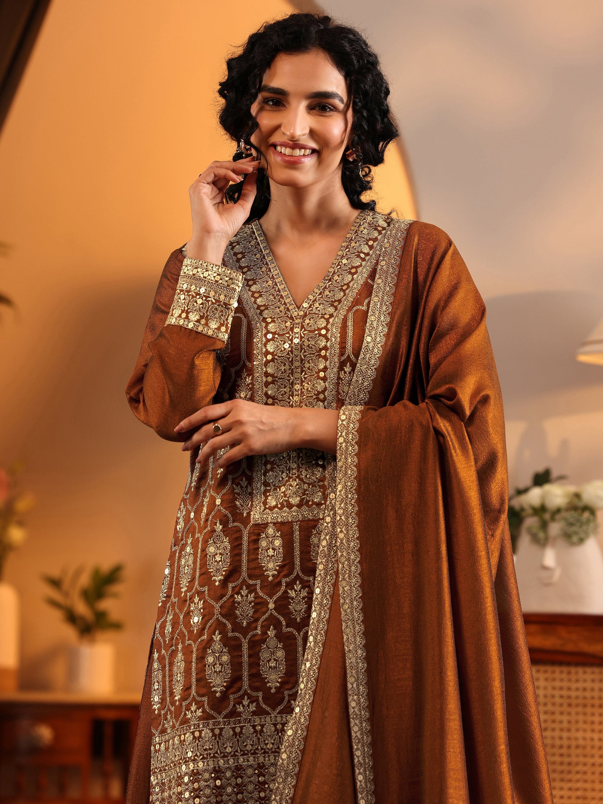 Our 3-piece brown silk blend straight-fit kurta set features a V-neckline, regular sleeves, and statement yoke. Complemented with palazzo pants with a partially elasticated waistband and 2 pockets, and an embroidered dupatta. Adorned with embroidered embellishments, this style is perfect for festive wear.