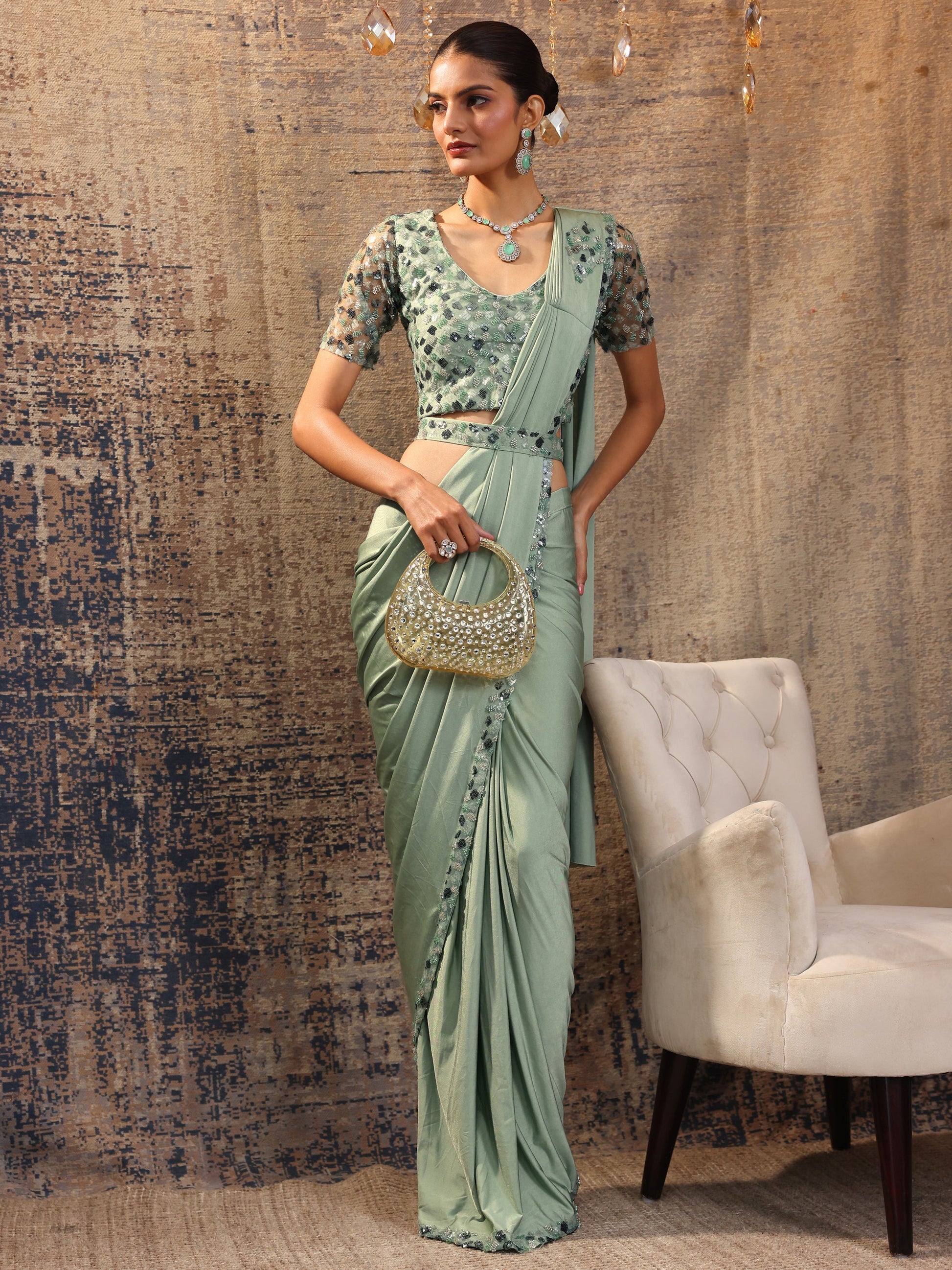 Our Sea Green Printed Nylon Saree Features Captivating Solid Print. Complemented With A stitched Blouse and waistbelt. This Charming Saree Is Perfect For Festive Wear