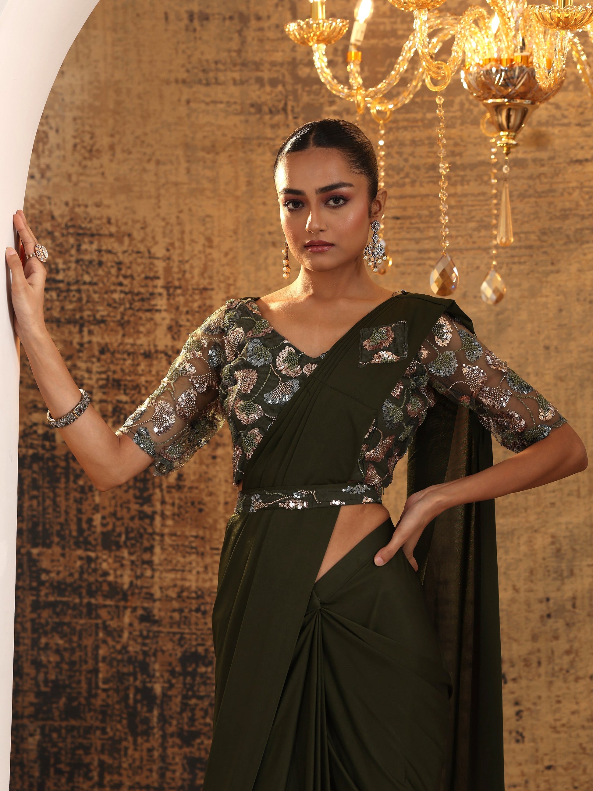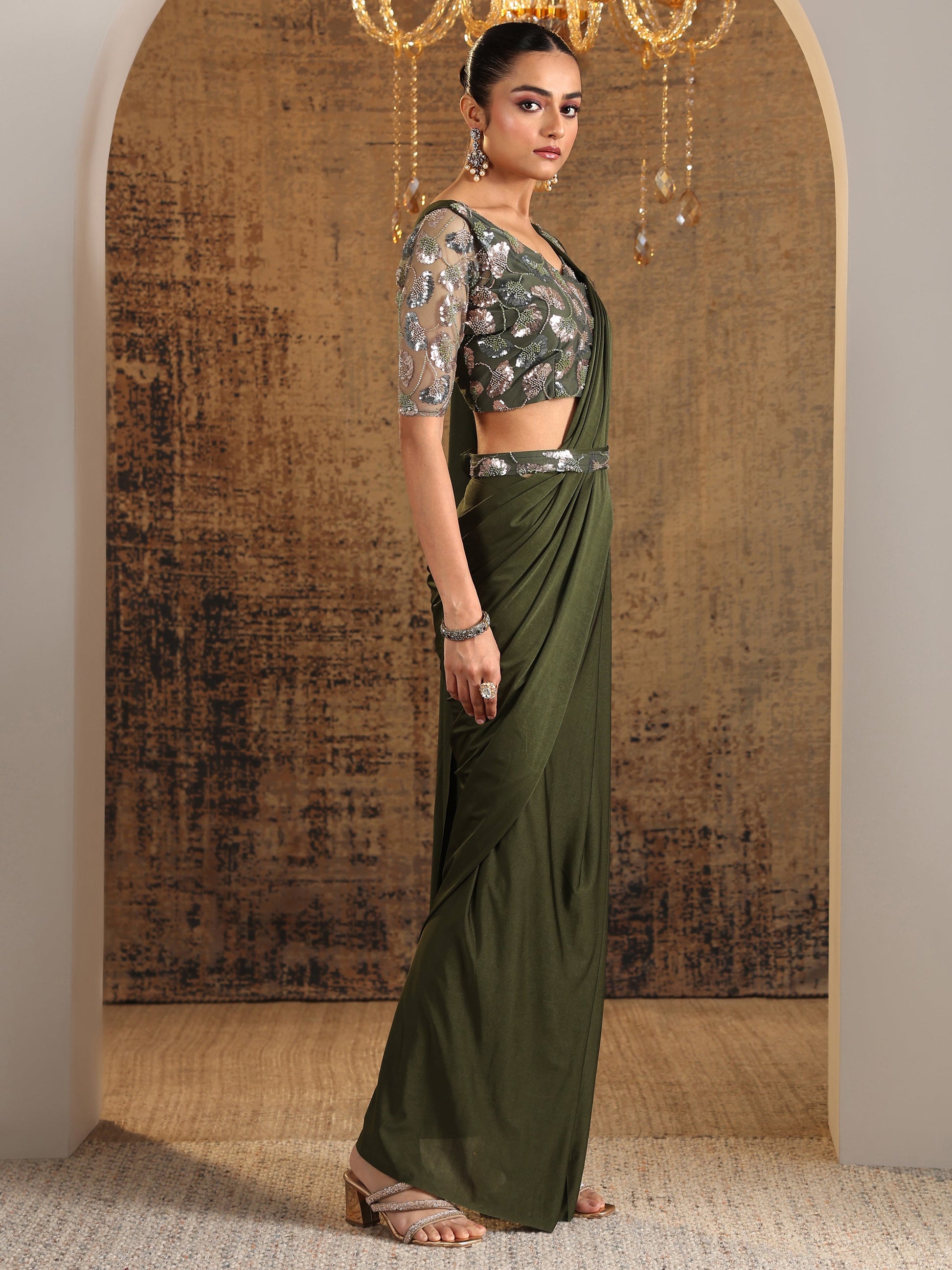 Our Green solid saree, crafted in nylon fabric, features a solid with intricate Zari work. Complemented with stitched blouse with waistbelt. This style is perfect for festive celebrations.