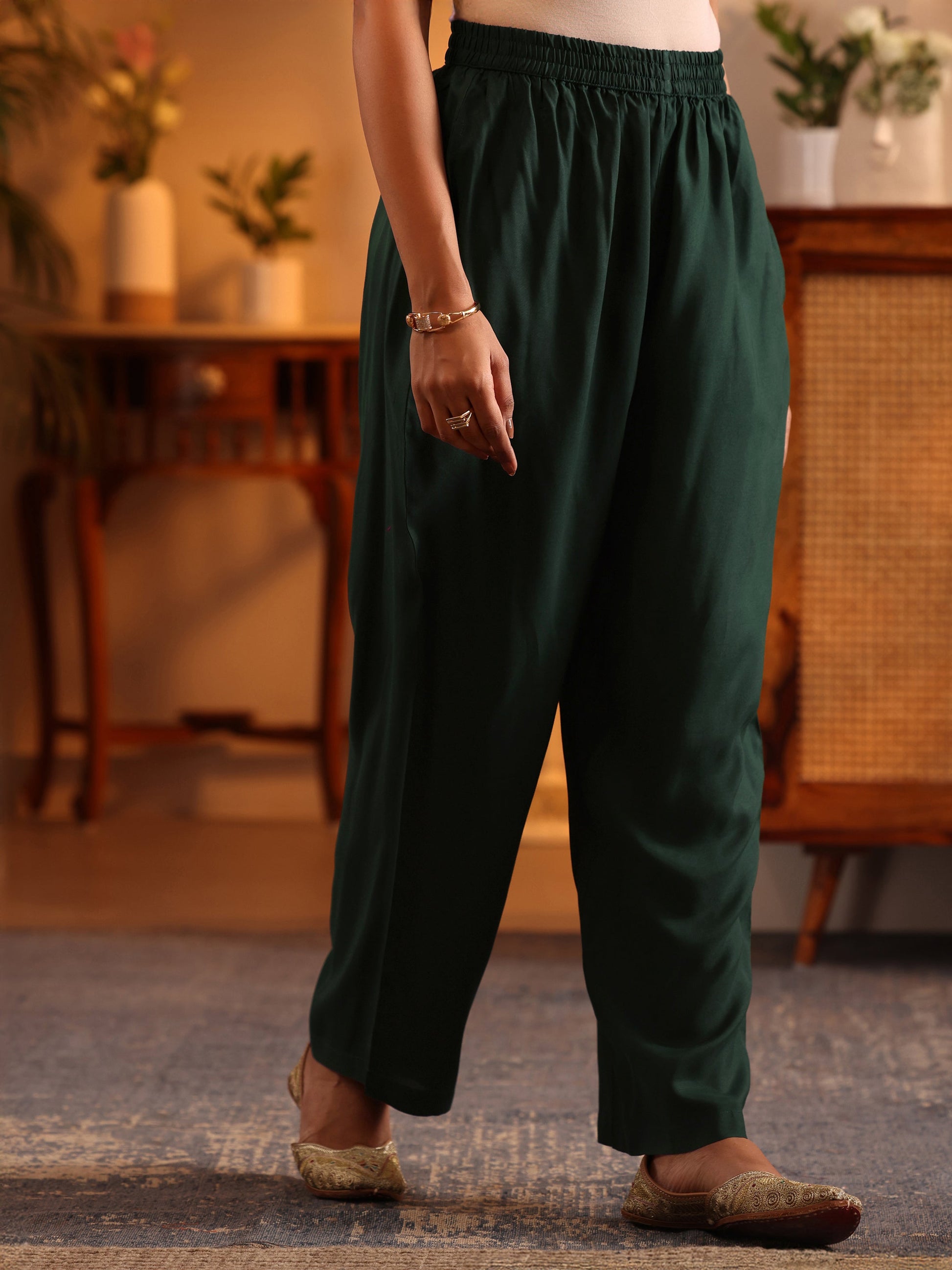 Our 3-piece green silk blend Anarkali kurta set features a round neckline, regular sleeves, and statement yoke. Complemented with lining and straight pants with a partially elasticated waistband and 2 pockets, and a printed dupatta. Adorned with embroidered accents, this style is perfect for festive wear.