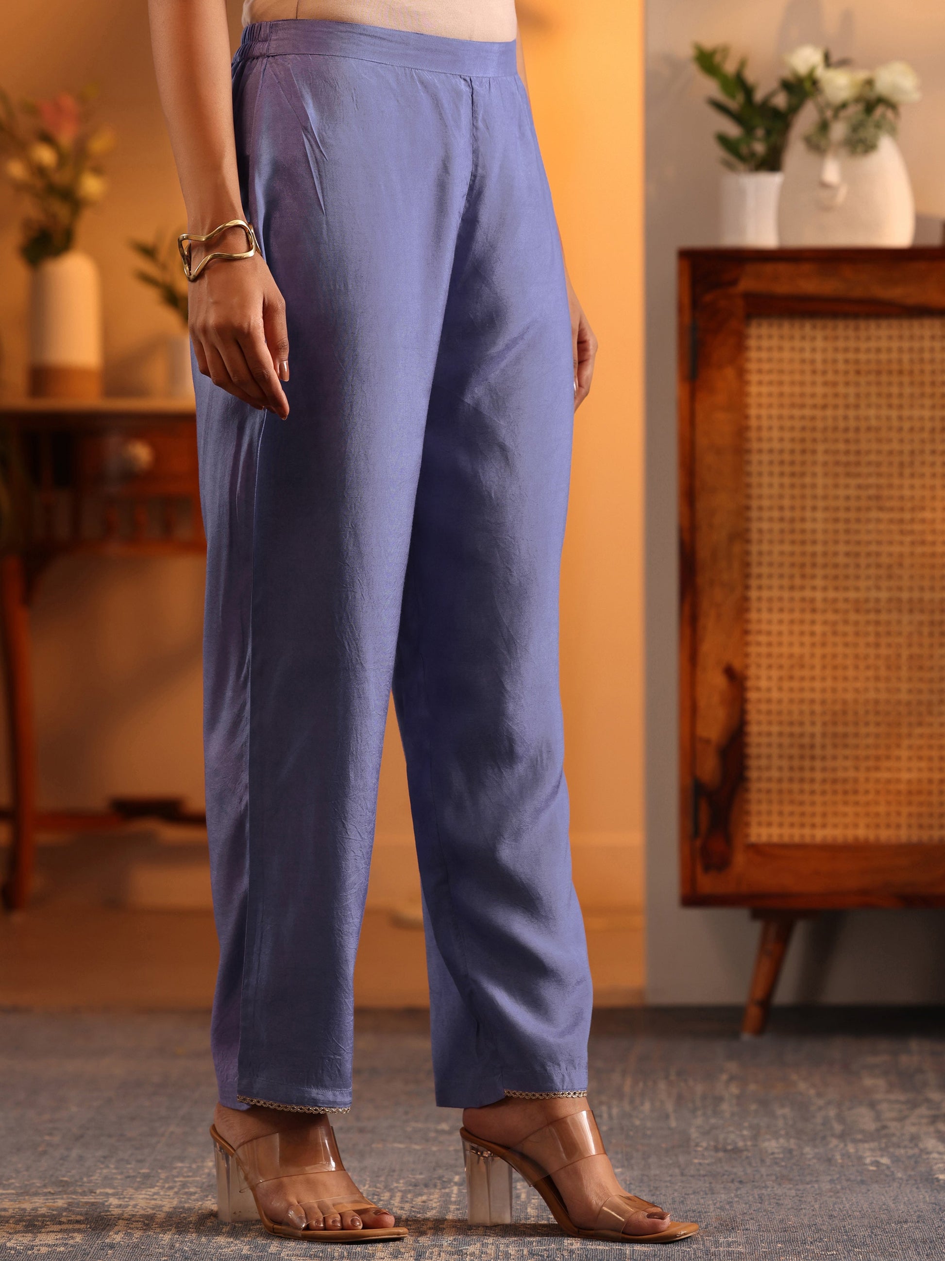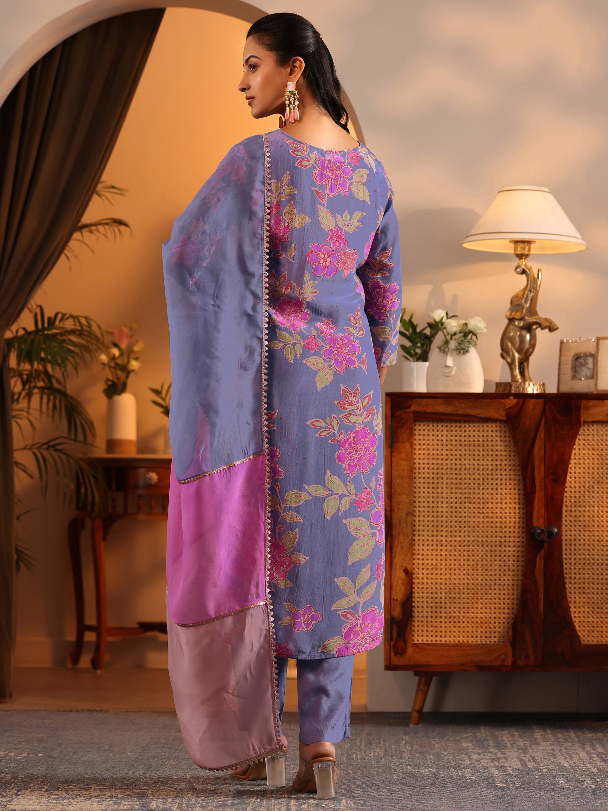 Our 3-piece blue and pink crepe straight-fit kurta set features a V-neckline, regular sleeves, and statement yoke. Complemented with straight pants with a partially elasticated waistband and 2 pockets, and a solid dupatta. Adorned with floral prints and embellished accents, this style is perfect for festive wear.