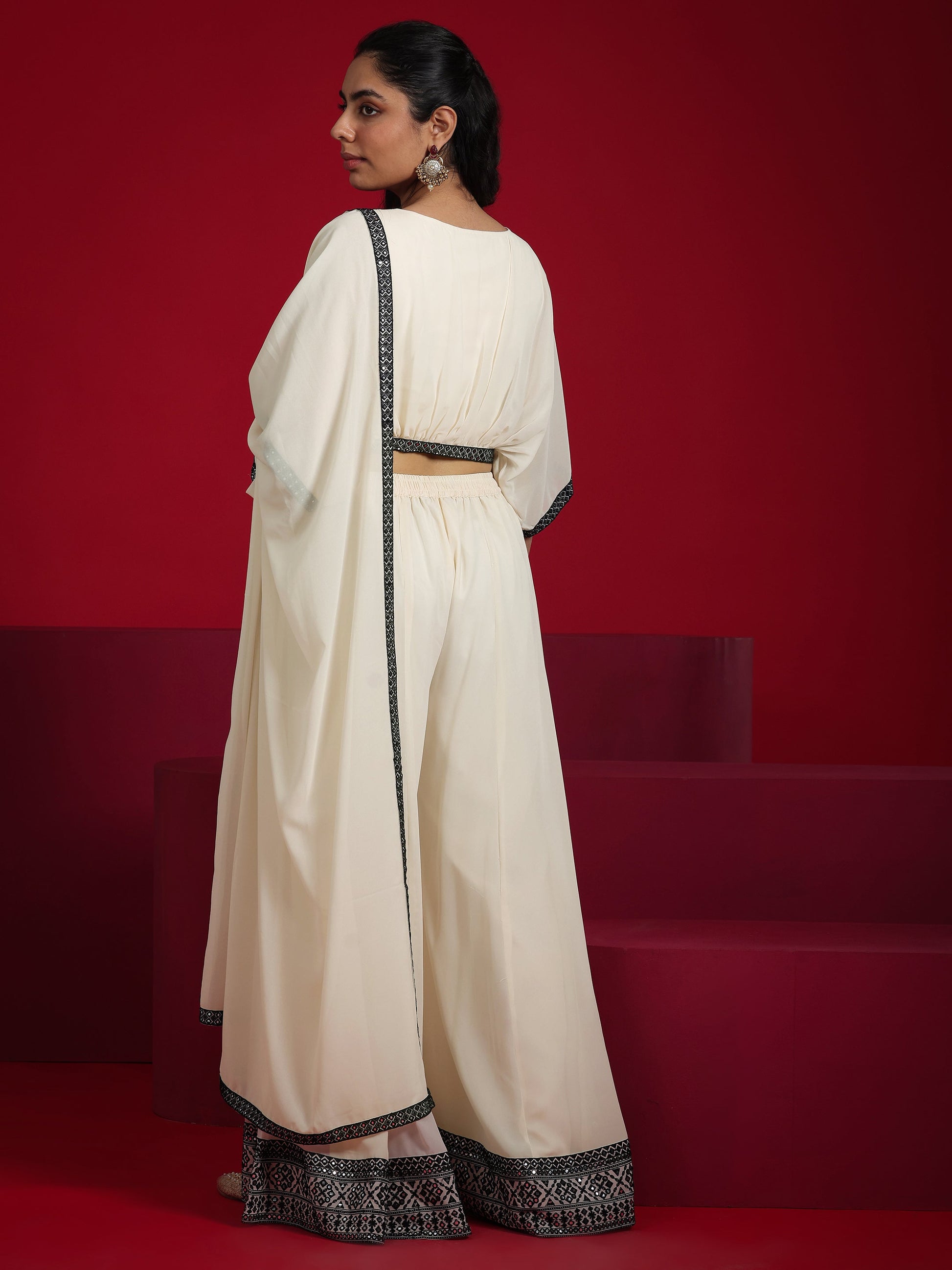Our 2-piece Off White Georgette co-ord set features a Straight-fit Tunic with a Round Neck neckline and Short Sleeves. Complemented with matching Palazzos with an Elasticated waistband. Highlighted with Embroidered, this style is perfect for Festive.